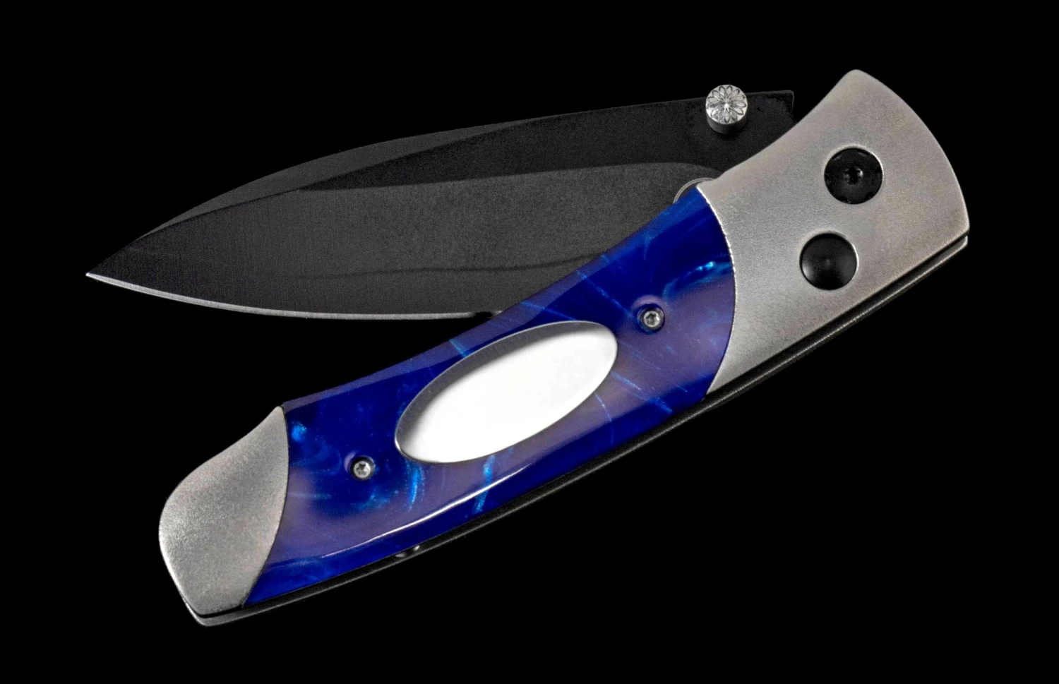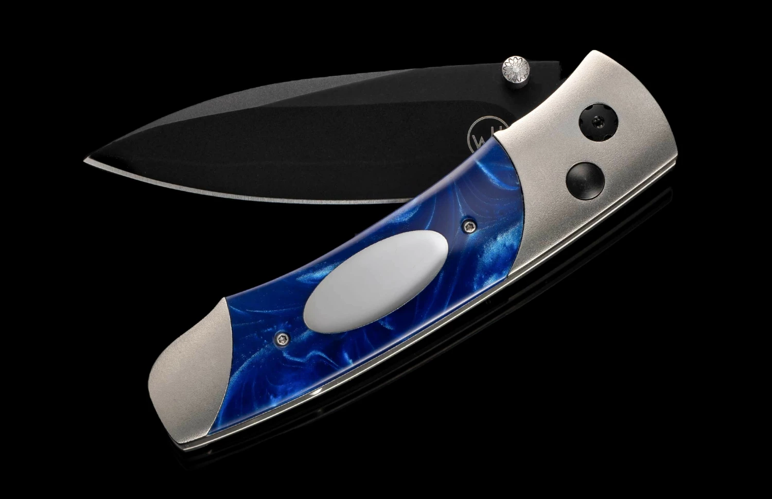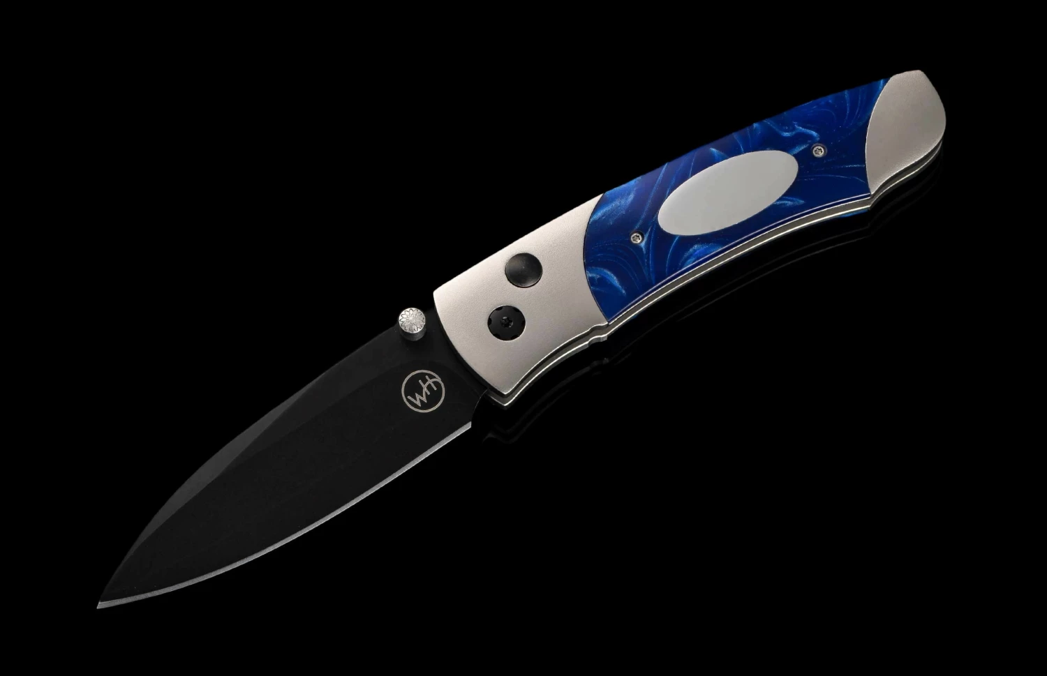 William Henry’s A200 expands on our tradition of fine folding knives with a design that has a little attitude, a lot of finesse, and remarkable utility in a compact and lightweight package. Each blade is crafted from CPM 20-CV stainless steel honed to a razor edge. The frame is hand-finished aircraft grade titanium with inlaid Kirinite, an exceptionally durable polymer. Finished with a stainless clip and stainless fittings, and proudly built in the USA. The A200-1E provides a stainless insert for creating your custom engraved message.