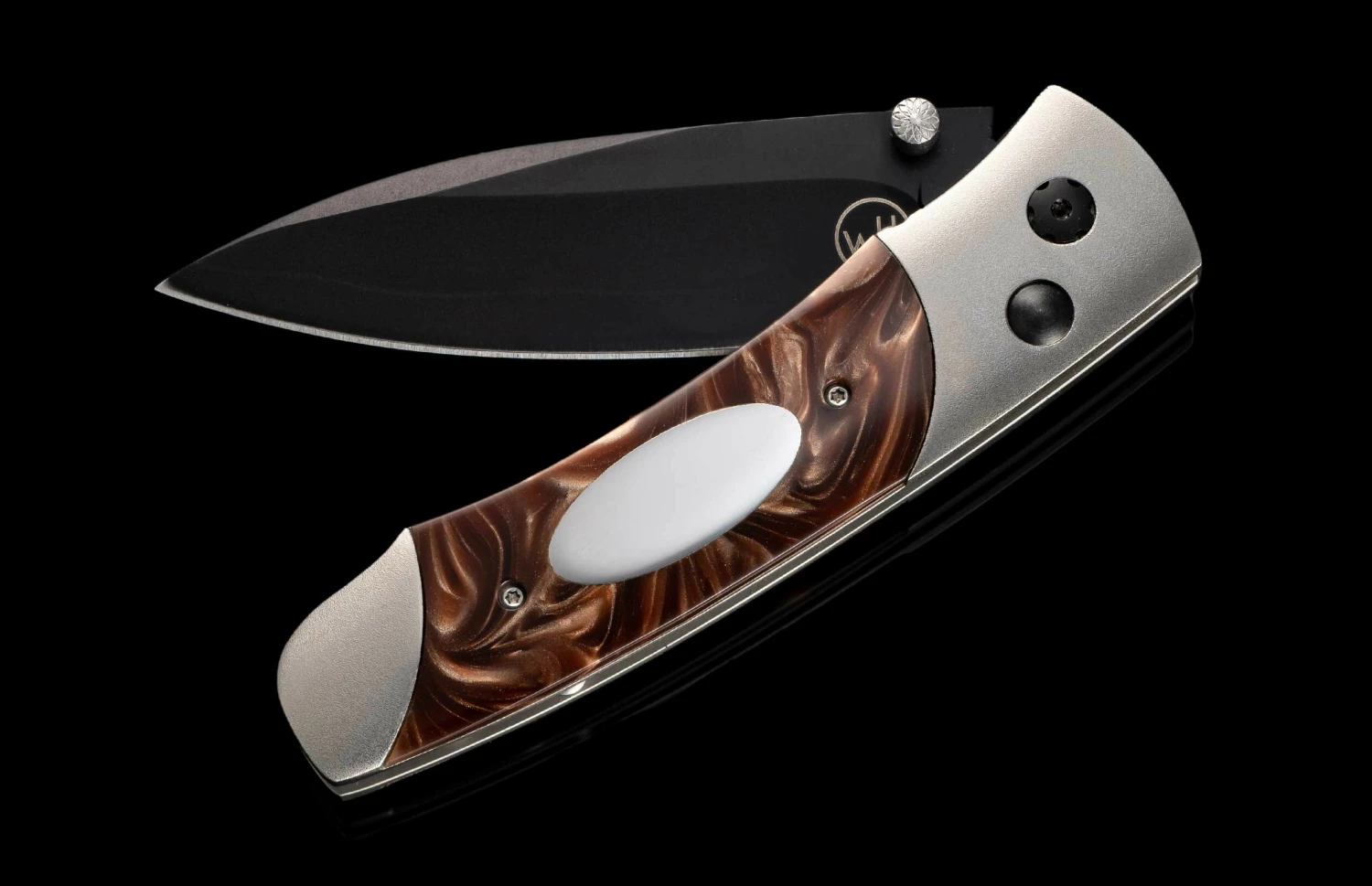 The A200-3B features a frame in hand-finished aerospace grade titanium, and inlays of compressed acrylic resin with an inset engraving plate. The blade is crafted from a three layer billet featuring a core of 10Cr15Mov, a rugged stainless steel honed to a razor’s edge. Final touches include black DLC (diamond like coating) on the blade and select fittings, and a pocket clip that allows safe ‘tip-down’ carry.