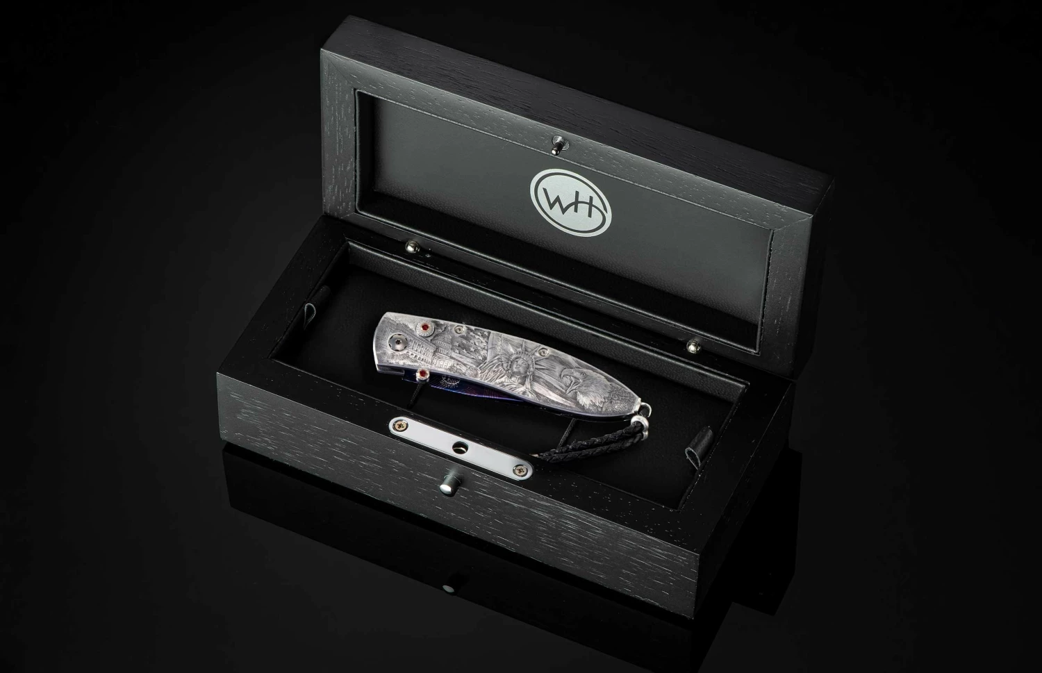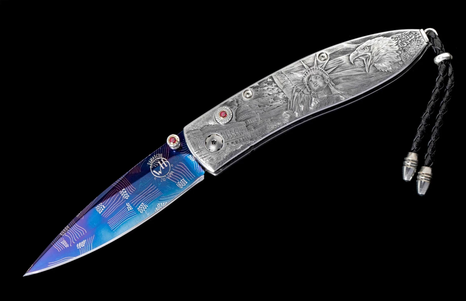 The Monarch ‘America’ features a mesmerizing stainless steel frame, hand-engraved in Italy by the master artisans of Bottega Incisioni. The beautiful hand-forged blade is heat-blued carbon ‘Flag’ damascus steel; the one-hand button lock and the thumb stud are set with red garnets. The Monarch is a simple design that is easy on the eye and effortless in the hand; the elegant shape of the handle on this design is also an ideal canvas to showcase fine hand-engraving or exotic materials. The ‘America’ features hand-forged metals, and hundreds of hours of microscopic hand-engraving which are the hallmark of William Henry’s most exclusive creations; a timeless heirloom to be proudly worn and used for a lifetime before being handed-down to another generation.