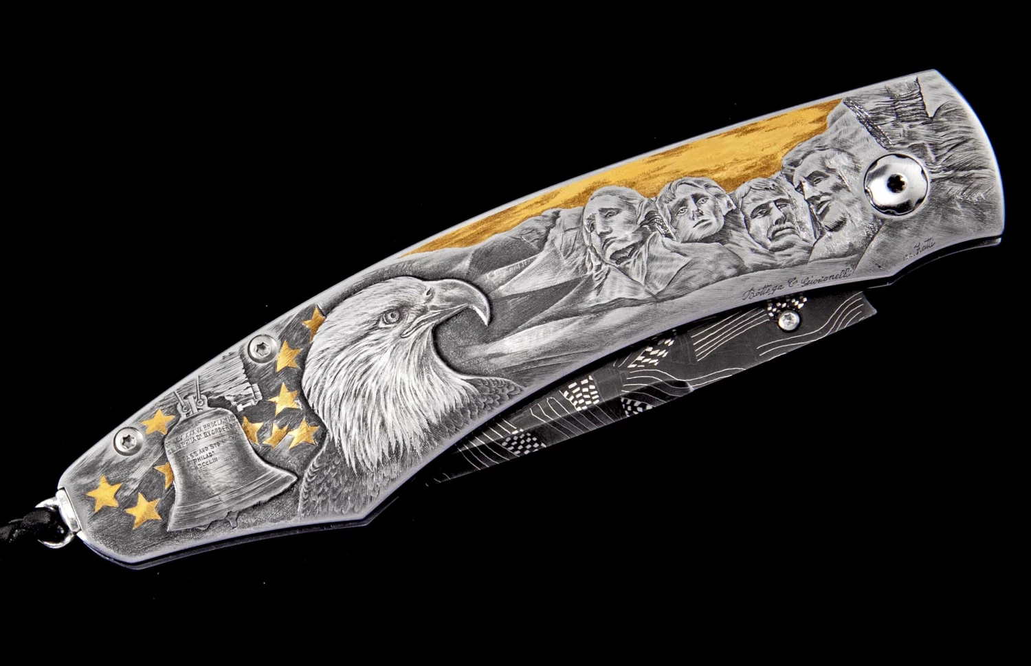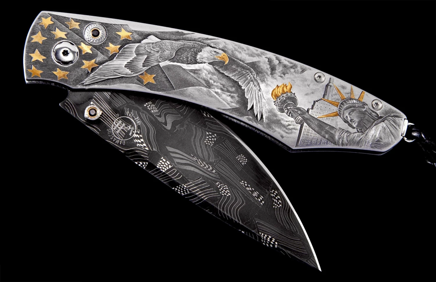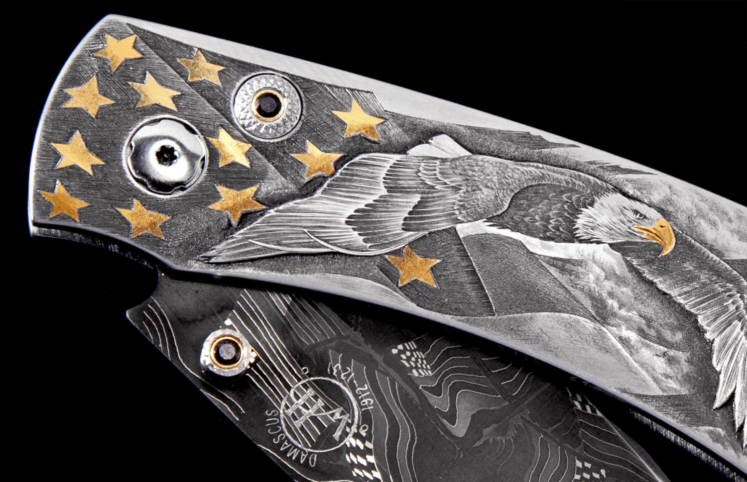 The Spearpoint ‘American Pride III’ features stainless steel frame, hand-engraved with 24K gold inlay by Bottega Incisioni. The beautiful hand-forged blade is etched ‘Flag’ damascus steel by Chad Nichols; the one-hand button lock and the thumb stud are set with spinel gemstones. A remarkable instrument with a full-size secure grip and versatile deep-belly blade, the Spearpoint epitomizes William Henry’s core philosophy – that superlative function deserves to be elevated to superlative art. The ‘American Pride III’ features hand-forged metals, and hundreds of hours of microscopic hand-engraving which are the hallmark of William Henry’s most exclusive creations; a timeless heirloom to be proudly worn and used for a lifetime before being handed-down to another generation.
