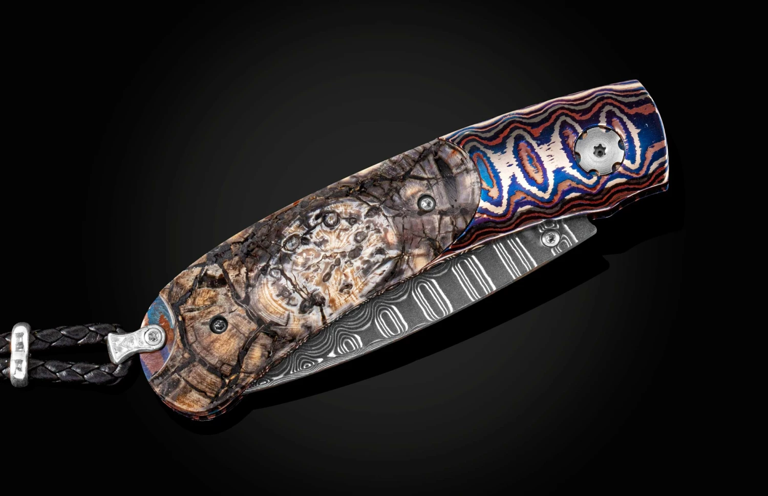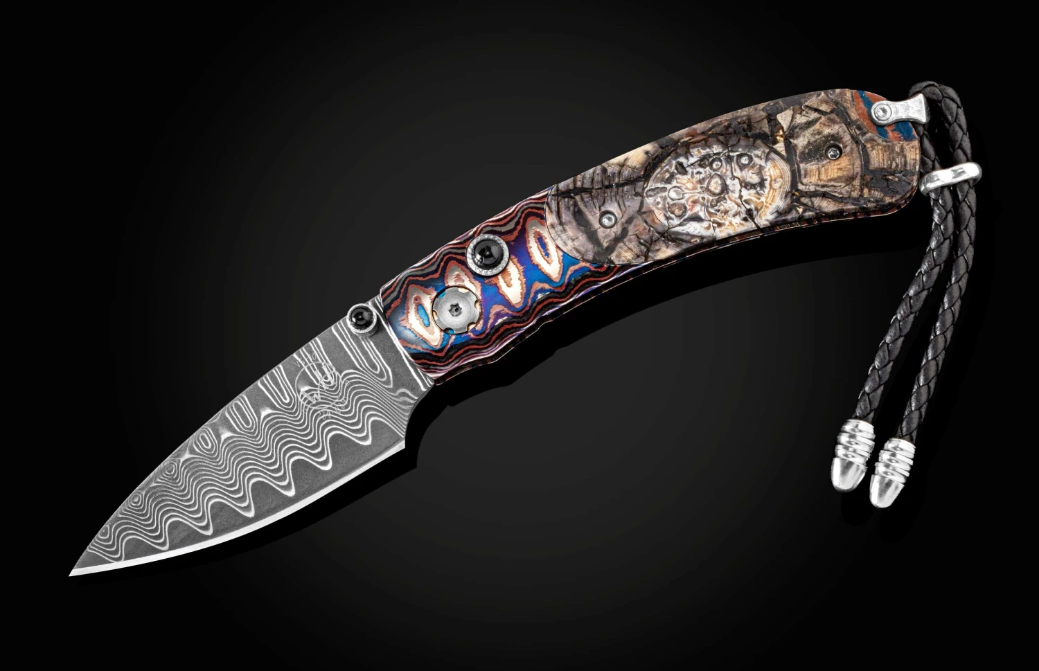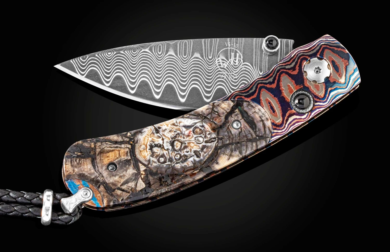 The Kestrel ‘Aura’ features a beautiful and unique frame in ‘Wave Mokume’, inlaid with the ring-cut section of a 10,000 year-old fossil Woolly Mammoth tusk. The blade is ‘Wave’ damascus with a VG-10 core; the one-hand button lock and the thumb stud are set with black onyx gemstones. The Kestrel is a compact, versatile folder; the design, which offers a deep finger groove at the intersection between the handle and blade, makes it remarkably comfortable in the hand while being very small and easy to carry. The ‘Aura’ features some of the exotic materials, and hand-forged metals that are the hallmark of William Henry’s collections; a timeless heirloom to be proudly worn and used for a lifetime before being handed-down to another generation.