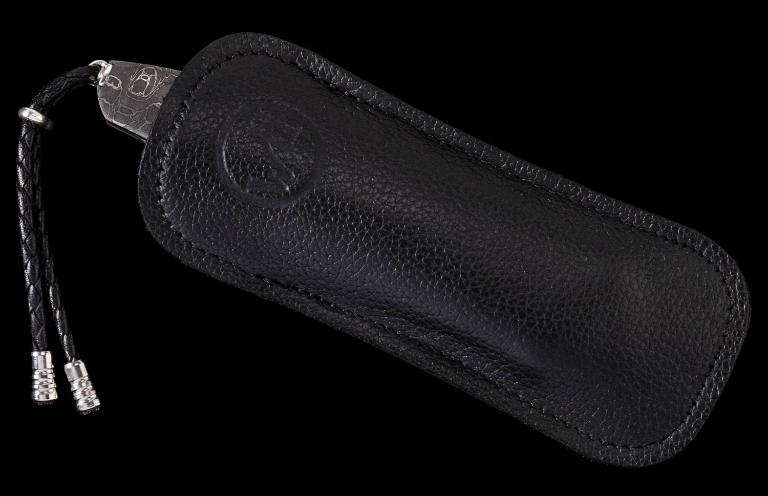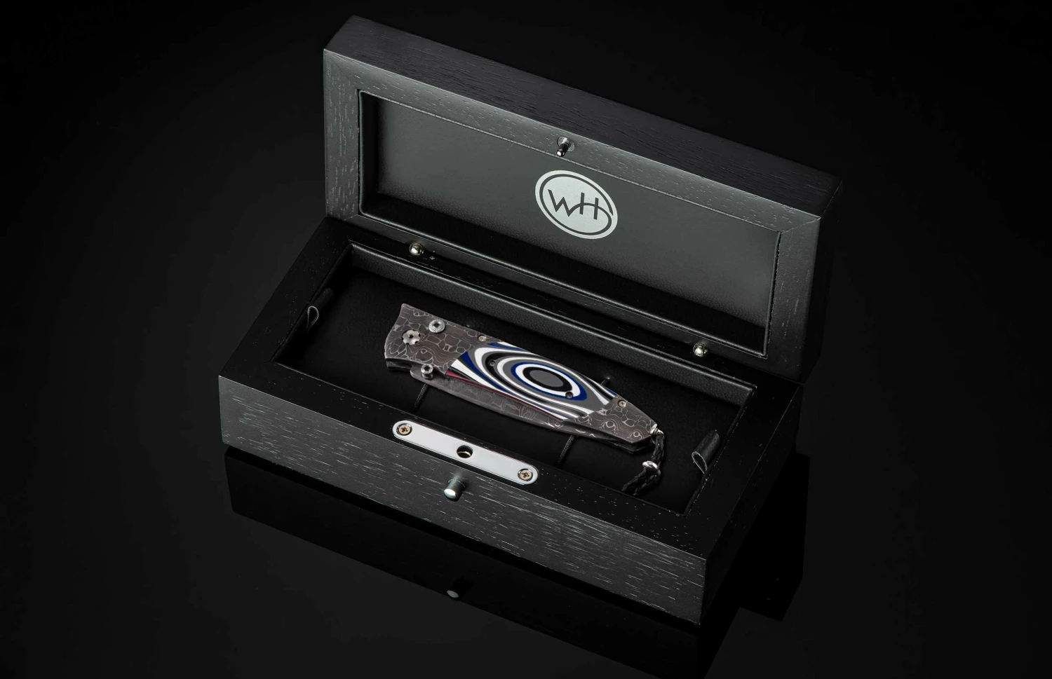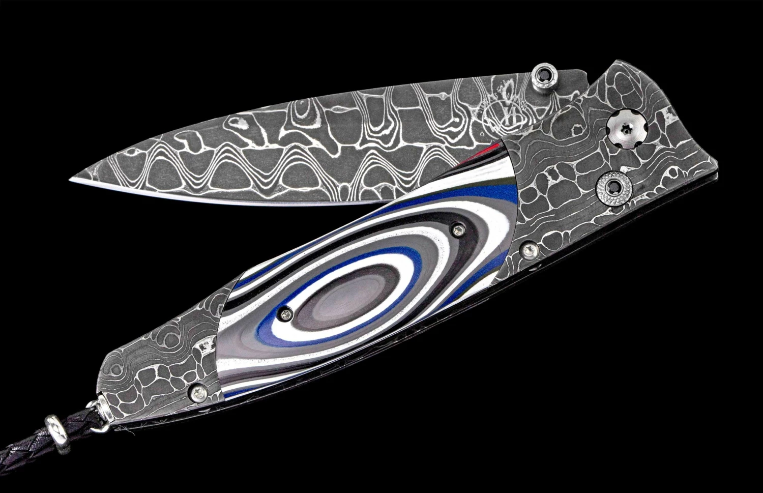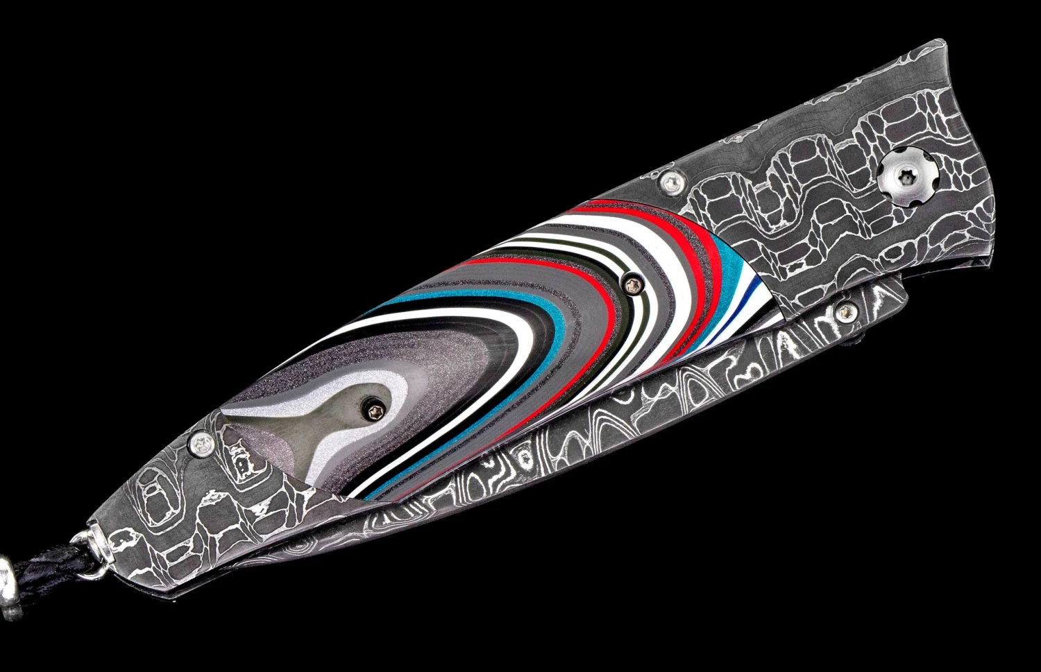 The Gentac ‘Off Road’ features beautiful bolsters in hand-forged ‘Croc Skin’ damascus by Chad Nichols, inlaid with Fordite. The blade is hand-forged ‘Intrepid’ damascus steel, also by Chad Nichols; the one-hand button lock and the thumb stud are set with spinel gemstones. An exceptional design that offers rigorous performance in a sleek, comfortable knife, the Gentac is also the perfect canvas to showcase William Henry’s range of exotic materials and techniques. The ‘Off Road’ features some of the exotic materials and forged metals that are the hallmark of William Henry’s collections; a distinctive personality statement to be worn and used for a lifetime.