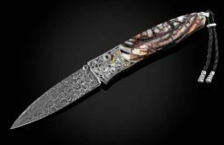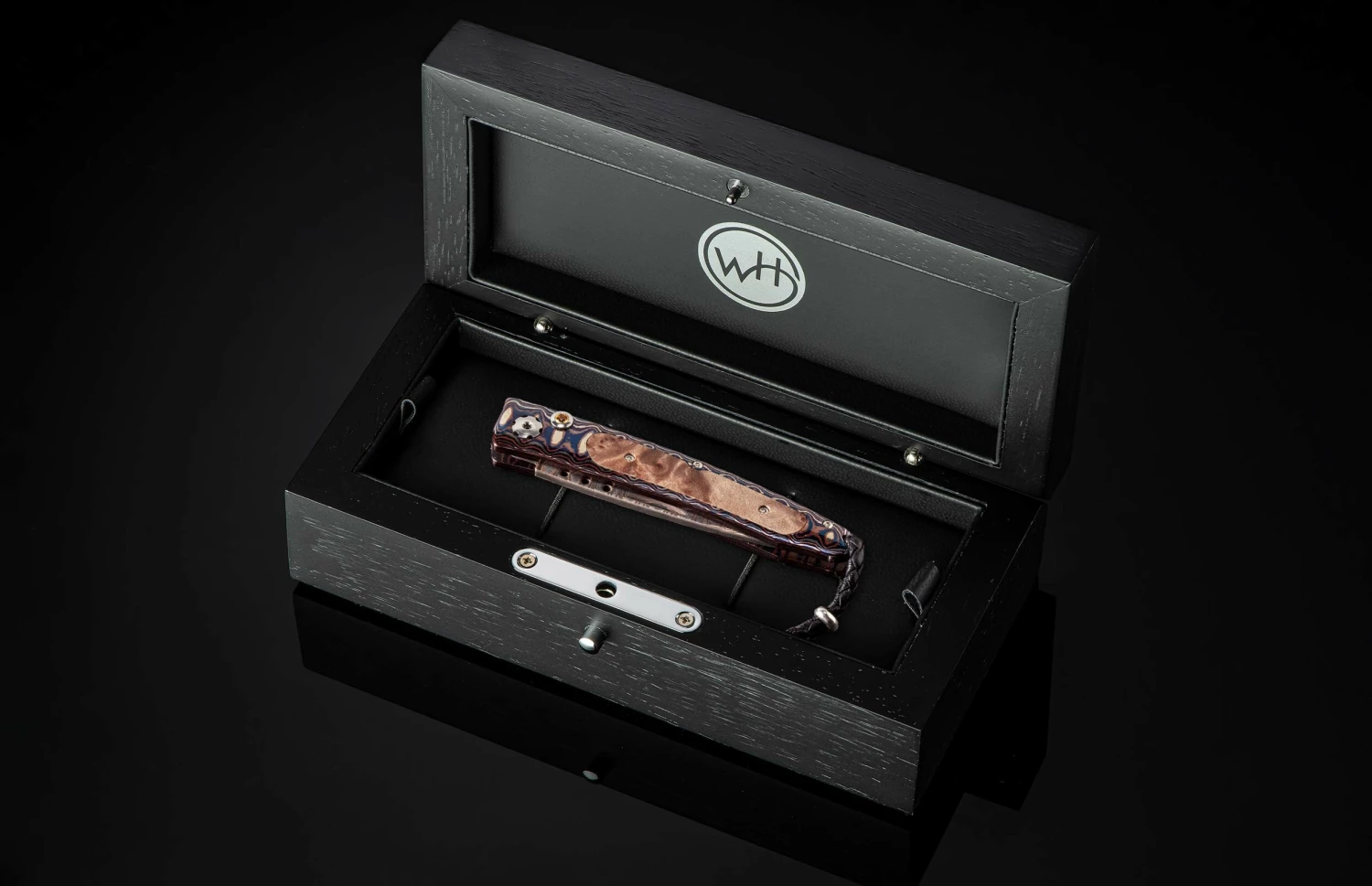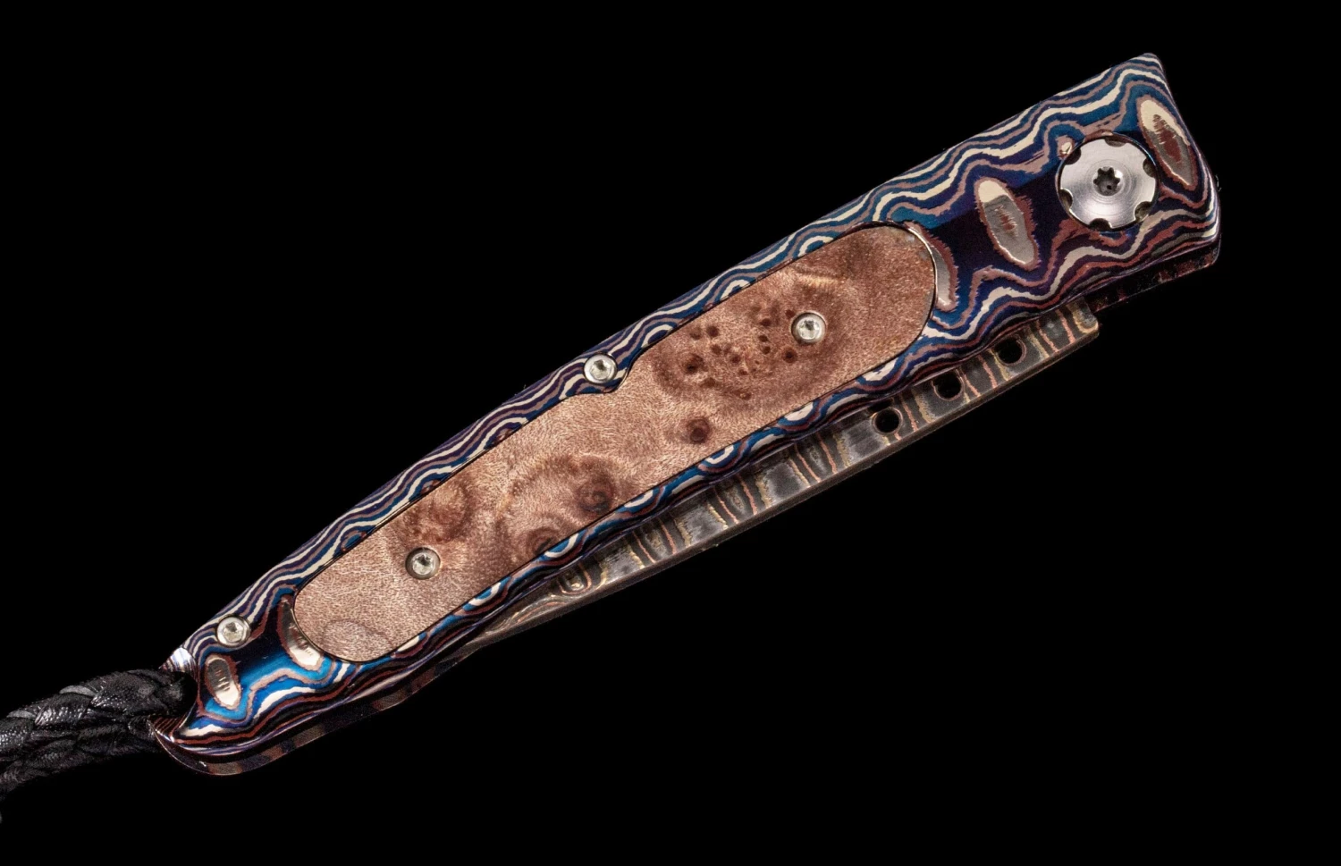 The Ventana ‘Blue Burl’ features a frame is in heat-colored ‘Wave Mokume’ gane inlaid with maple burl wood. The blade is ‘Copper wave’ damascus with a core in strong VG-5 steel. The two-hand button lock is set with a spessartite gemstone. The Ventana folding knife is our homage to the classic gentlemen’s pocket knives of a bygone era, showcasing the rare and exotic inlays that are one of the hallmarks of William Henry’s collections. The ‘Blue Burl’ features a perfect synthesis of function, modern and exotic materials; a distinctive personality statement to be worn and used for a lifetime.