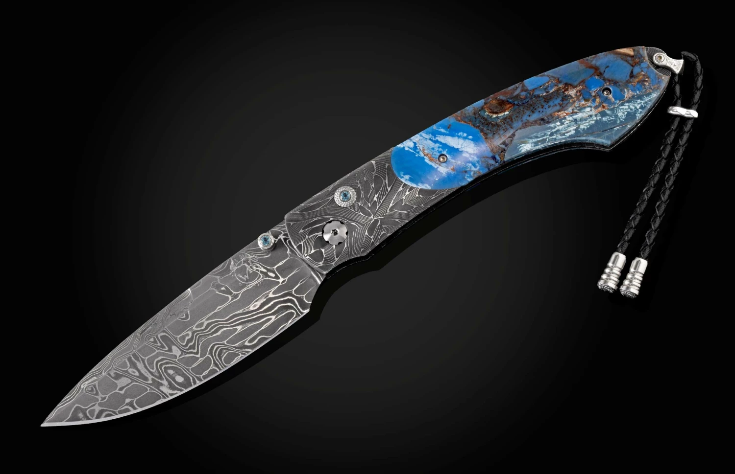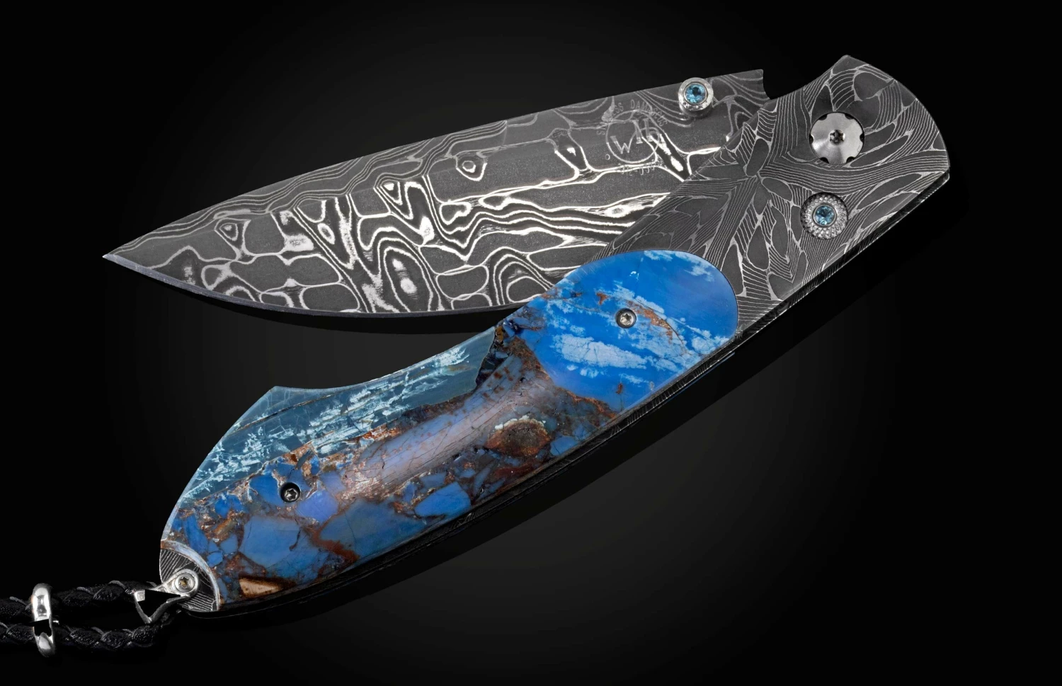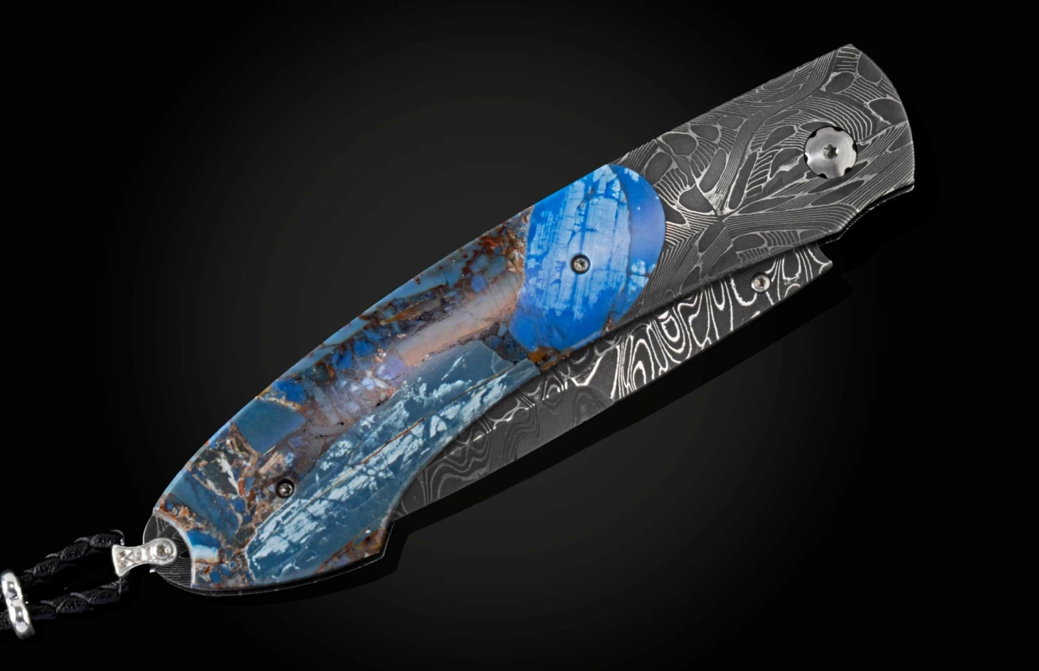 The Spearpoint ‘Blue Fusion’ features a beautiful frame in hand forged ‘X-Out’ damascus by Chad Nichols. The handle is inlaid with a mesmerizing scale of ‘Mammoth Fusion’. The blade is hand-forged ‘Intrepid’ damascus by Chad Nichols; the one-hand button lock and the thumb stud are set with blue topaz gemstones. A remarkable design that gives you an instrument with a full-size secure grip, and a versatile deep-belly blade, the Spearpoint epitomizes William Henry’s core philosophy – that superlative function deserves to be elevated to superlative art. The ‘Blue Fusion’ features some of the most exotic materials, superlative artistry, and hand-forged metals that are the hallmark of William Henry’s collections; a timeless heirloom to be proudly worn and used for a lifetime before being handed-down to another generation.