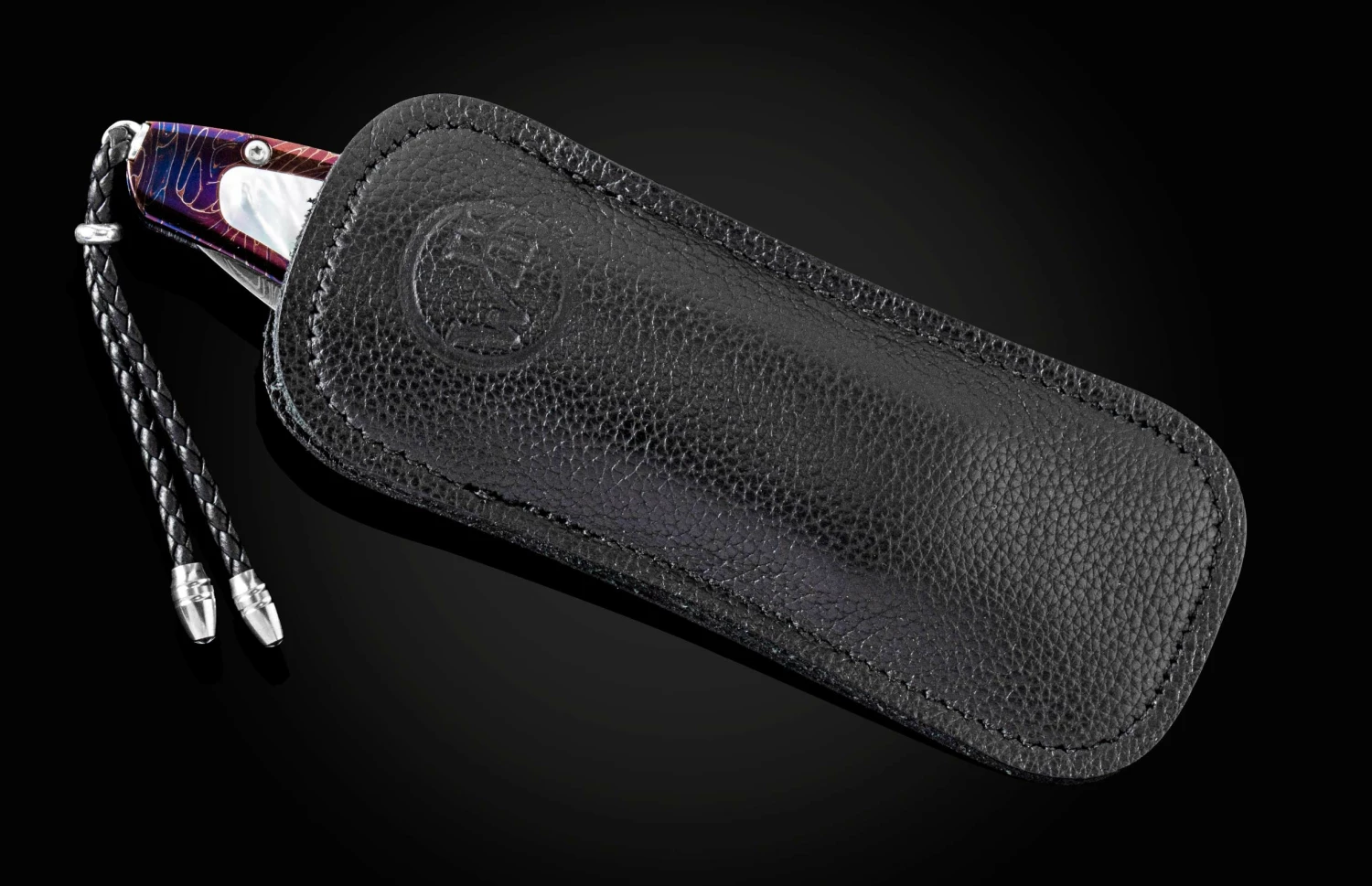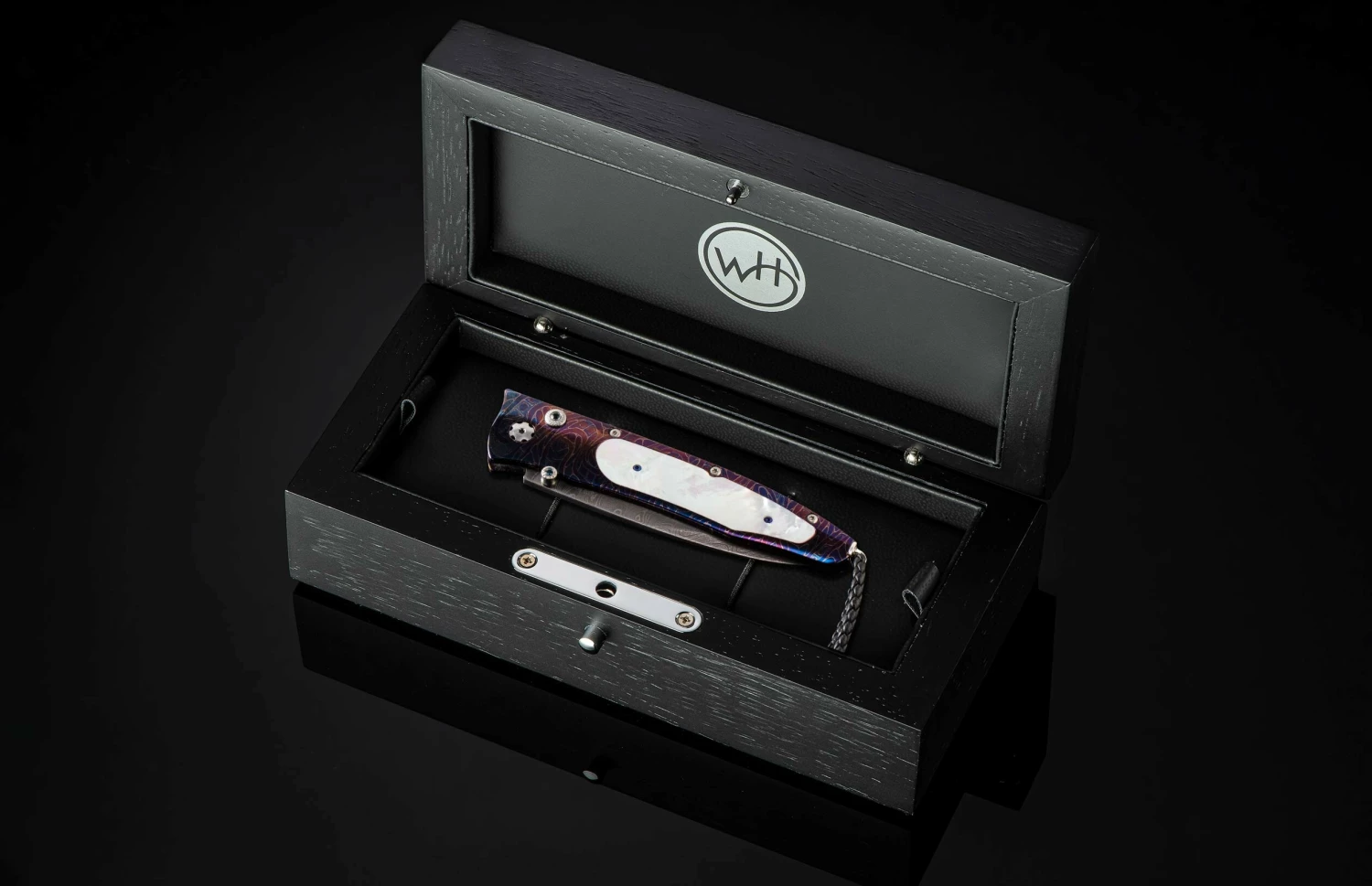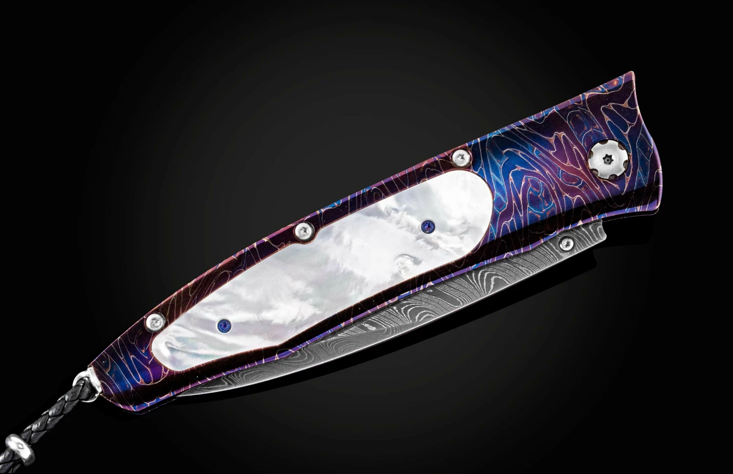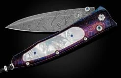 The Gentac ‘Blue Ocean’ features an intricate frame in hand-forged and heat-blued ‘Rolling Rock’ damascus by Chad Nichols, inlaid with Mother of Pearl. The blade is hand-forged ‘Boomerang’ damascus, also by Chad Nichols. The one-hand button lock and the thumb stud are set with London Blue topaz gemstones. An exceptional design that offers rigorous performance in a sleek, comfortable knife, the Gentac is also the perfect canvas to showcase William Henry’s range of exotic materials and techniques. The ‘Blue Ocean’ features some of the unique materials, artistry, and metals that are the hallmark of William Henry’s collections.