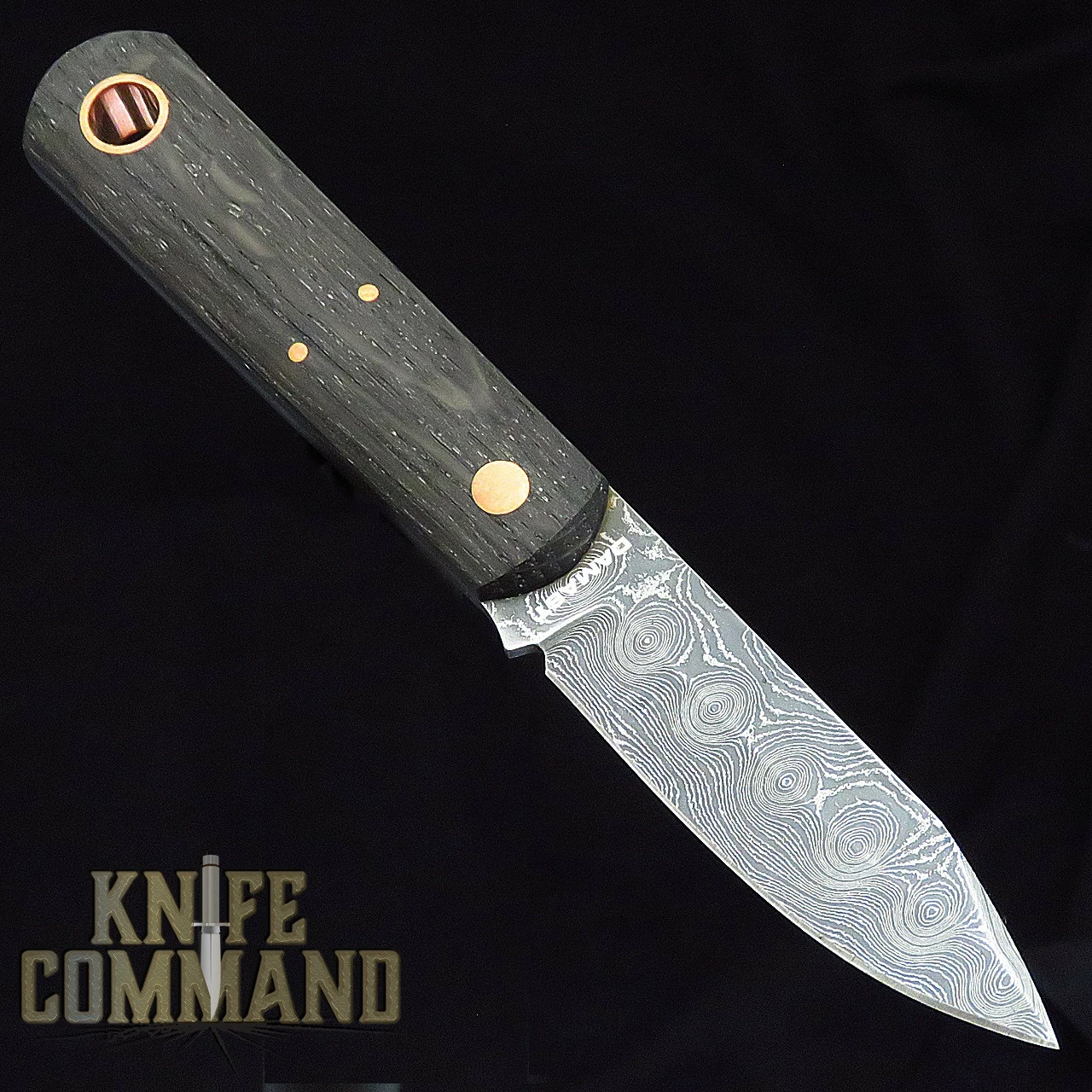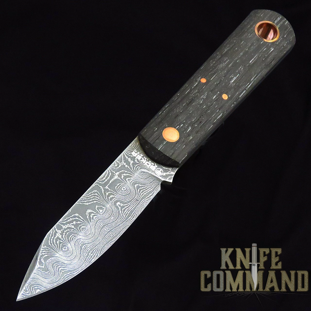 The BFF measures 6″ overall and has a 2.75″ blade. The .1″ thick blade is forged from Coil Belt pattern Damascus stainless steel by Chad Nichols. This full tang knife features Bog Oak Wood handle scales held in place by copper studs. For carrying, the BFF has a large, copper lined lanyard hole and comes in a black leather sheath with clip.