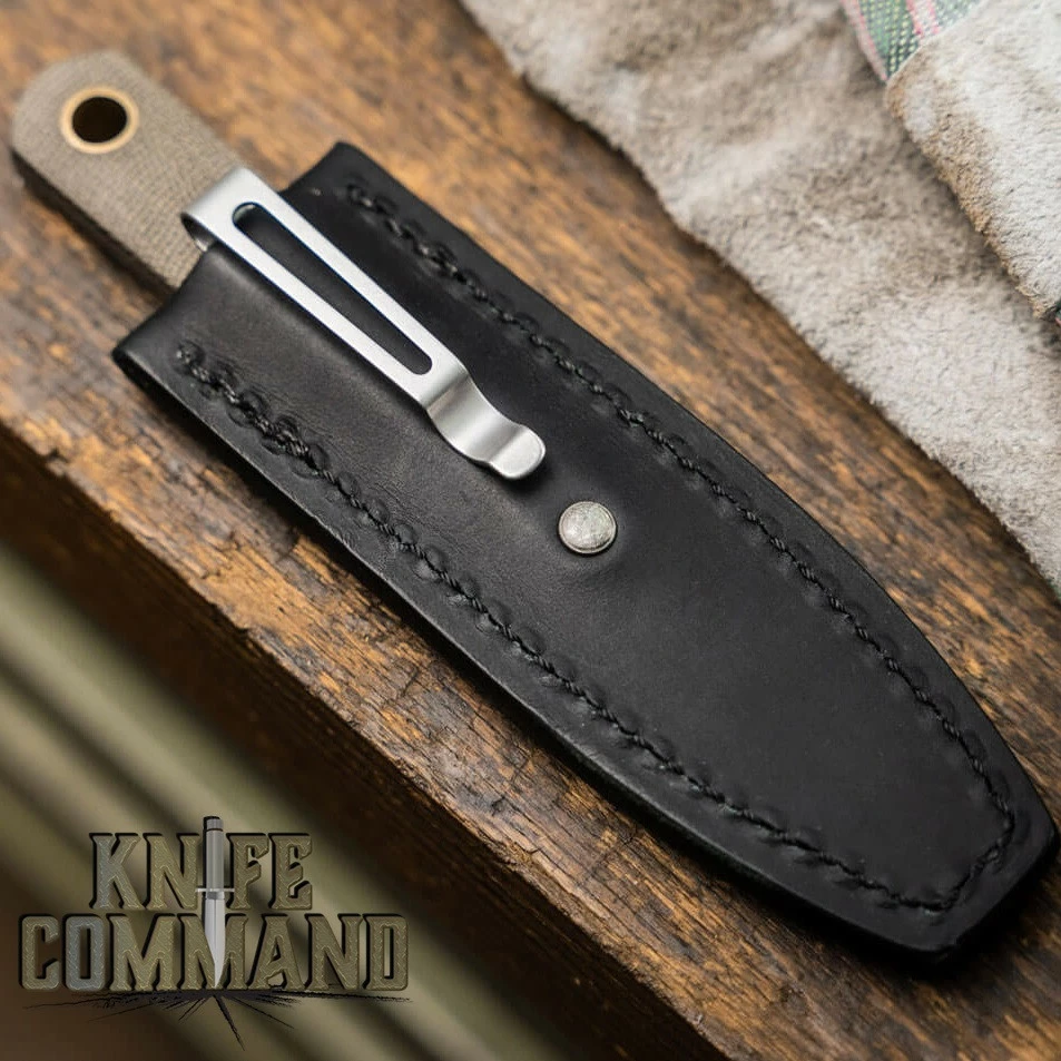 The BFF measures 6″ overall and has a 2.75″ blade. The .1″ thick blade is forged from AEB-L stainless steel and has a stonewash finish. This full tang knife features Green Canvas Micarta handle scales. For carrying, the BFF has a large, brass lined lanyard hole and comes in a black leather sheath with clip.