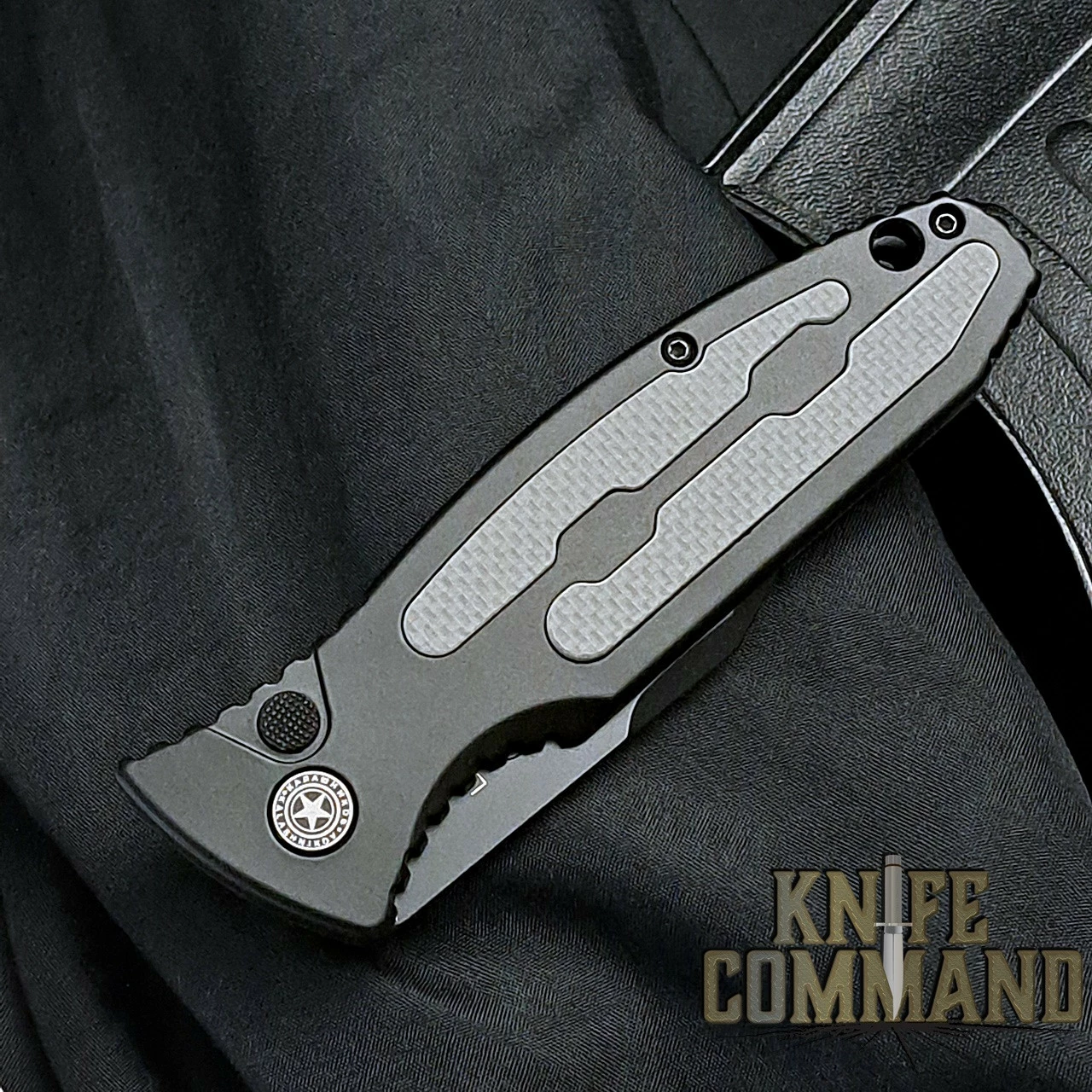 The Kalashnikov 74 Auto has an overall length of 7.68” and a closed length of 4.25″. The 3.35″ fine edge, Kalashnikov style Clip-point blade is made of black coated D2 steel. The black hardcoat-anodised 6061-T6 Aluminum handle has non-slip grey G10 inserts featuring the same contour as the front hand grip on an AK47. The pocket clip is moveable for tip-up or tip-down right hand carry and it has a lanyard hole.