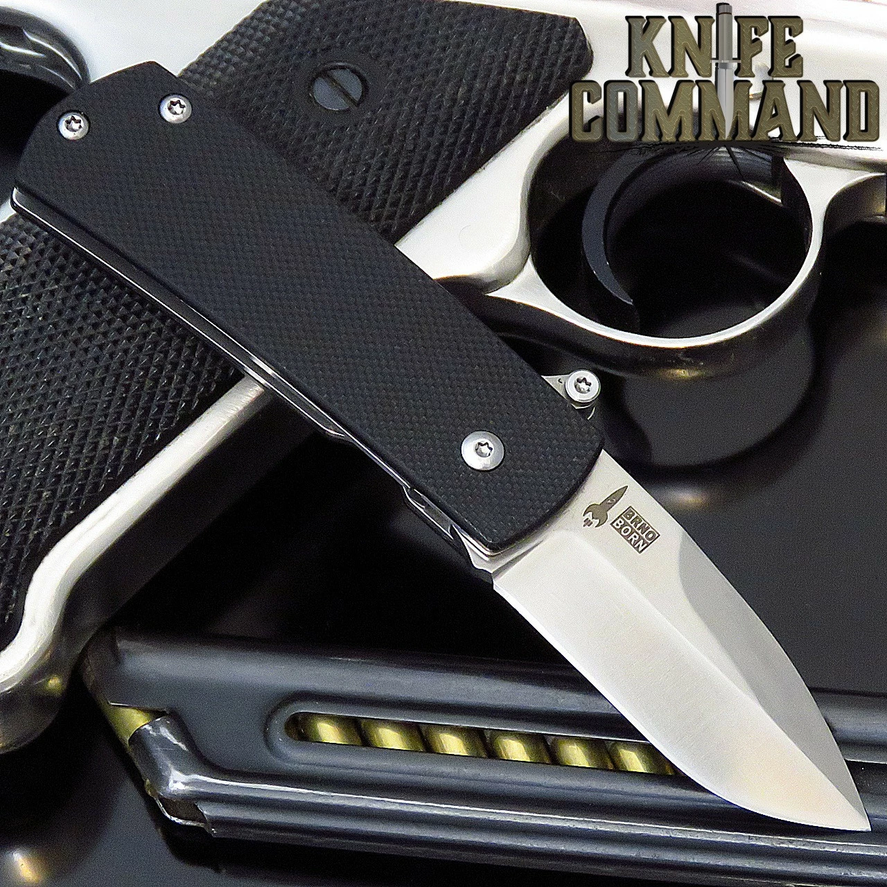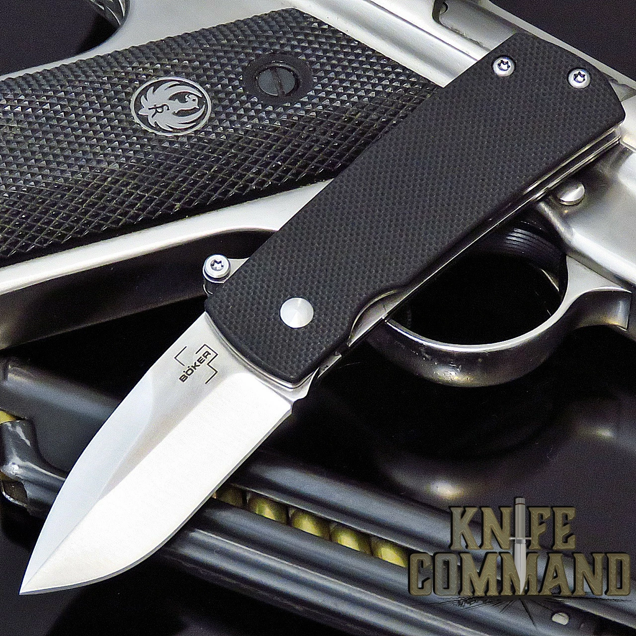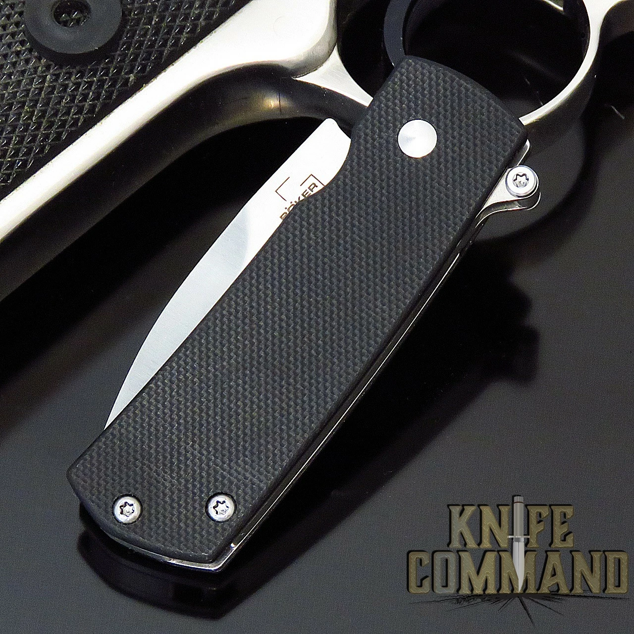 Boker says…”With the Boker Plus Shamsher, Darriel Caston and Stan Mojzis have designed a minimalist automatic knife which, with a total length of almost 12 centimeters, is certainly one of the handiest of its kind. The satin-finished blade made of D2 is opened automatically by spring force when the trigger, reminiscent of a classic pinball machine, is pressed and is securely locked by a linerlock.” The Textured G10 handles provide a safe grip.