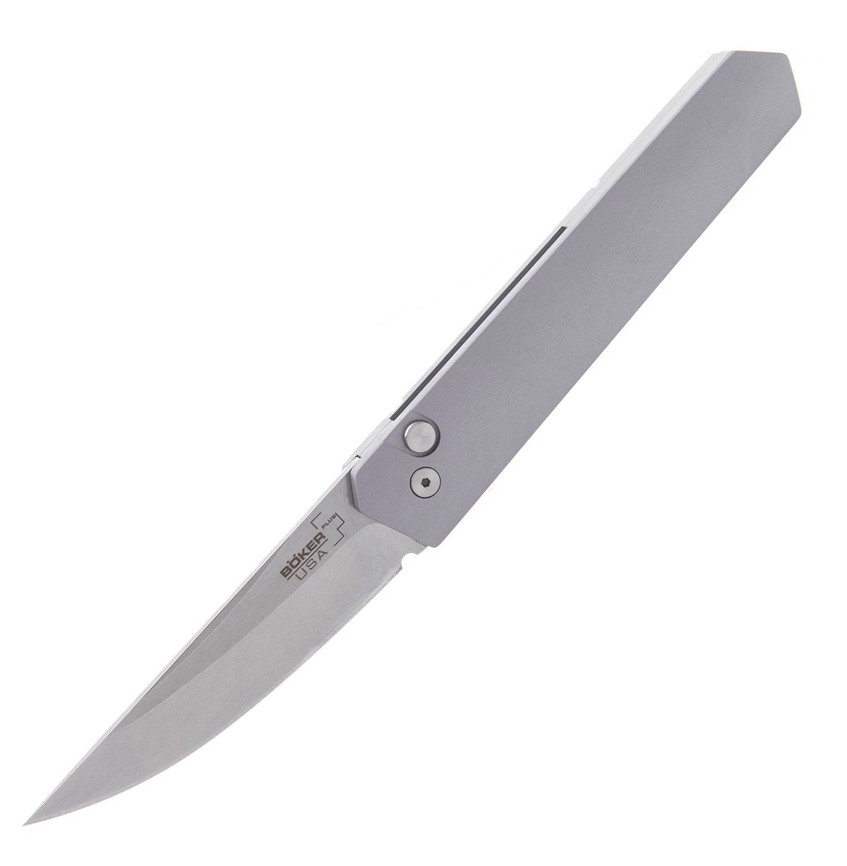 The Kwaiken Auto has an overall length of 8.375” and a closed length of 4.875″. The 3.5″ fine edge, straight spine Kwaiken blade is made of Stonewash finished 154CM stainless steel. The CNC milled Grey Aluminum handle has a minimalist design. It features a recessed button blade release that also acts as a plunge lock to keep the blade open. For carrying, the Kwaiken Auto has a tip-up pocket clip as well as a hidden lanyard loop.