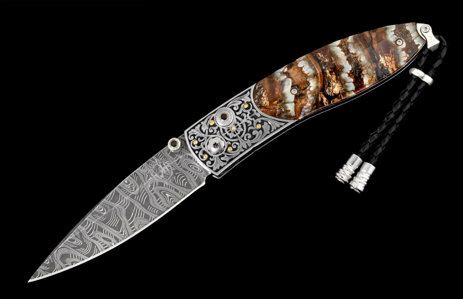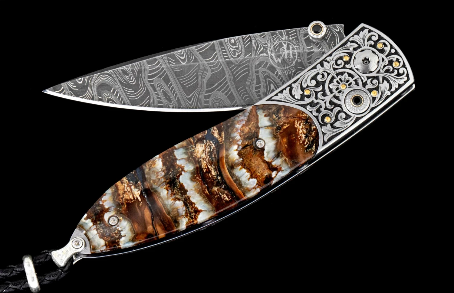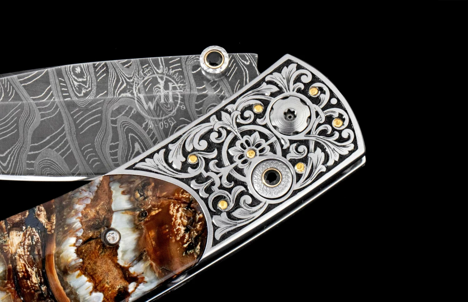 The Monarch ‘Bottega’ features a hand-engraved frame with 24K gold inlays by Bottega Incisioni, inlaid with fossil Woolly Mammoth tooth. The blade is hand-forged ‘Hornets Nest’ damascus by Mike Norris. The button lock and thumb stud are set with spinel gemstones. The Monarch is a simple design that is easy on the eye and effortless in the hand; the elegant shape of the handle on this design is also an ideal canvas to showcase fine hand-engraving or exotic materials. The ‘Bottega’ shows the rich and unique synthesis of the elegance, function, and superlative artistry that are the hallmark of William Henry’s work.