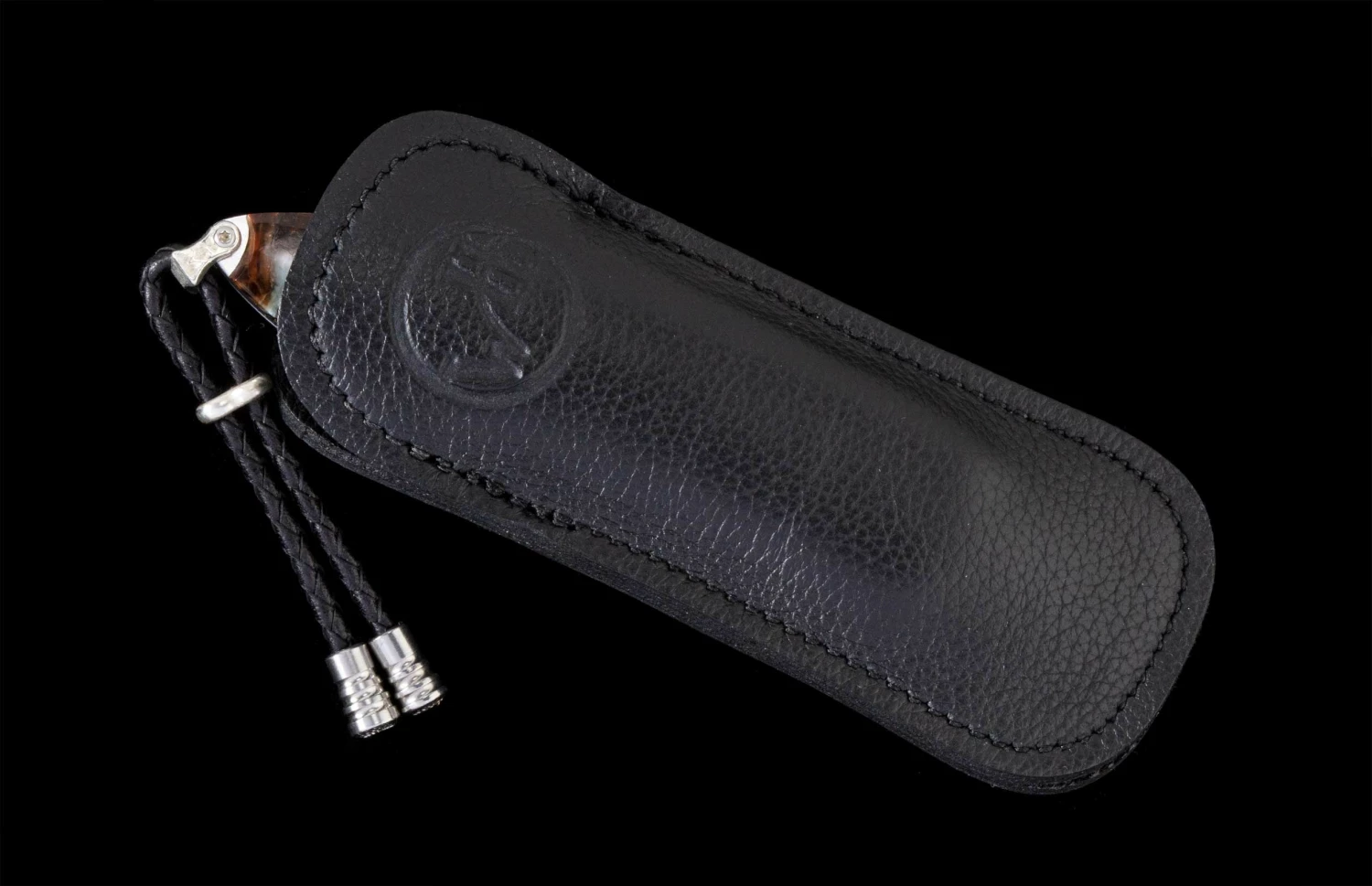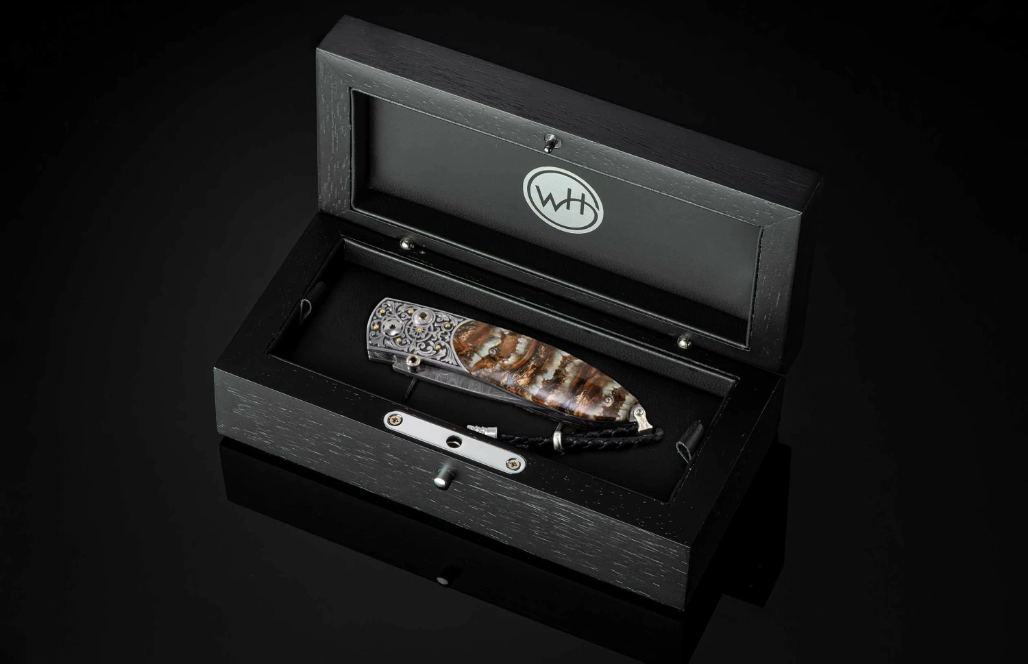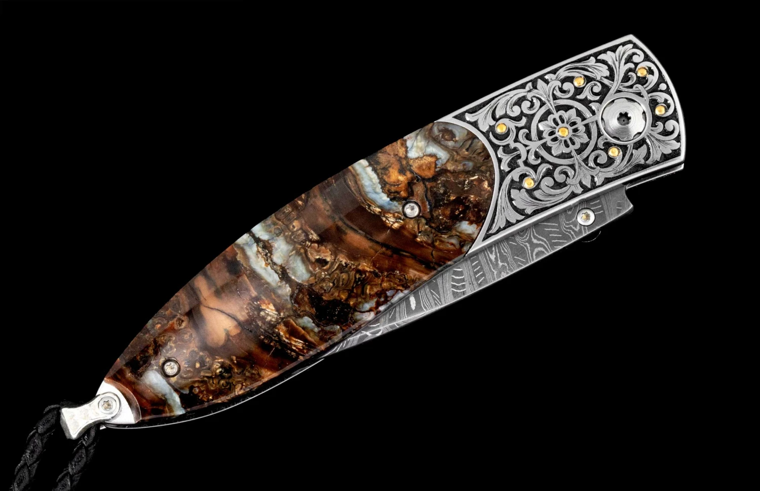 The Monarch ‘Bottega’ features a hand-engraved frame with 24K gold inlays by Bottega Incisioni, inlaid with fossil Woolly Mammoth tooth. The blade is hand-forged ‘Hornets Nest’ damascus by Mike Norris. The button lock and thumb stud are set with spinel gemstones. The Monarch is a simple design that is easy on the eye and effortless in the hand; the elegant shape of the handle on this design is also an ideal canvas to showcase fine hand-engraving or exotic materials. The ‘Bottega’ shows the rich and unique synthesis of the elegance, function, and superlative artistry that are the hallmark of William Henry’s work.