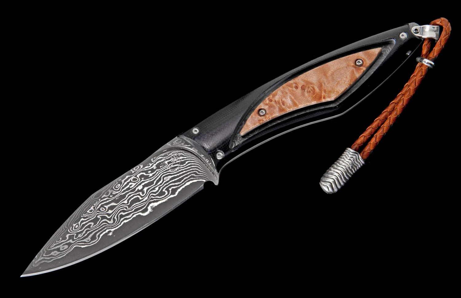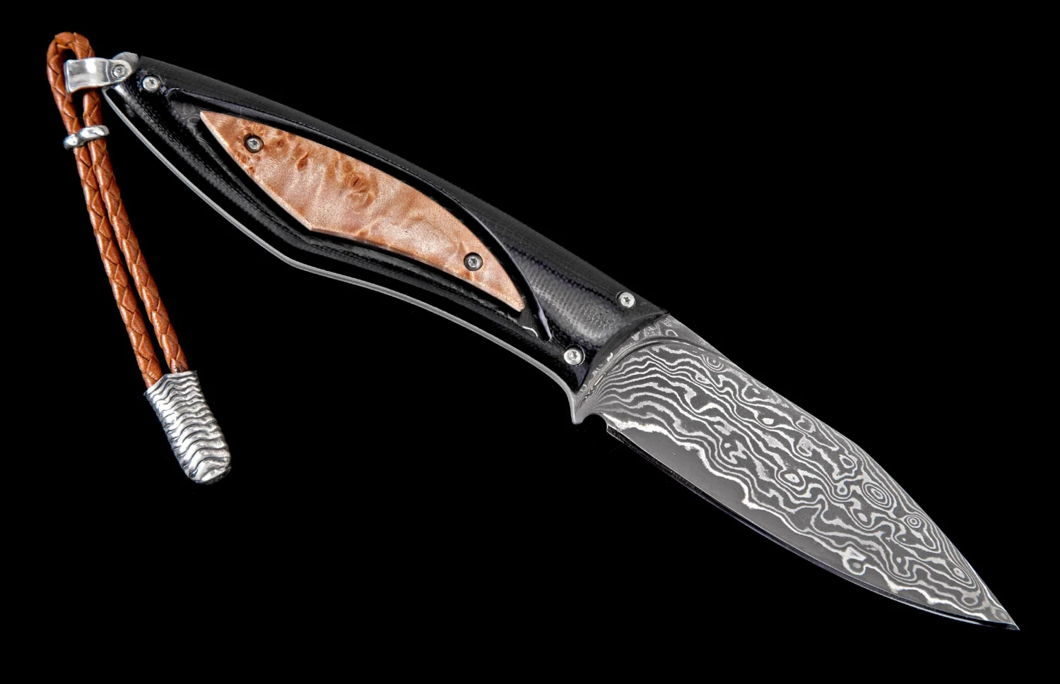 At William Henry, we love exotic woods. They are gorgeous, dynamic, unpredictable, and inspiring. The Burl features our resin-stabilized American maple burl, with bold pattern and nuanced chatoyance that captivates the eye. The burl is inset and framed by a black G10 composite handle, tough and comfortable. Fully polished by hand, assembled and dissembled multiple times, this architecture has an open channel to see thru to the damascus tang. The blade/tang are forged from 67 layers of three alloys, with a core of VG-10 at HRC 60 for optimal sharpness and wear resistance. Finished with a leather lanyard, sterling silver accents, and includes a sturdy brown leather sheath.