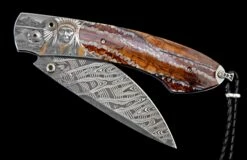 The Spearpoint ‘Chief Joseph’ features a hand-engraved frame with 24K gold, 16K green gold, and silver inlays by Matyas Balazs, inlaid with a stunning piece of 10,000 year-old fossil Woolly Mammoth tooth. The blade is hand-forged ‘Hornets Nest’ damascus by Chad Nichols. The one-hand button lock and the thumb stud are set with spinel gemstones. A remarkable design that gives you an instrument with a full-size secure grip, and a versatile deep-belly blade, the Spearpoint epitomizes William Henry’s core philosophy – that superlative function deserves to be elevated to superlative art. The ‘Chief Joseph’ features the artistry, and exotic materials that are the hallmark of William Henry’s work; a timeless heirloom to be proudly worn and used for a lifetime before being handed-down to another generation