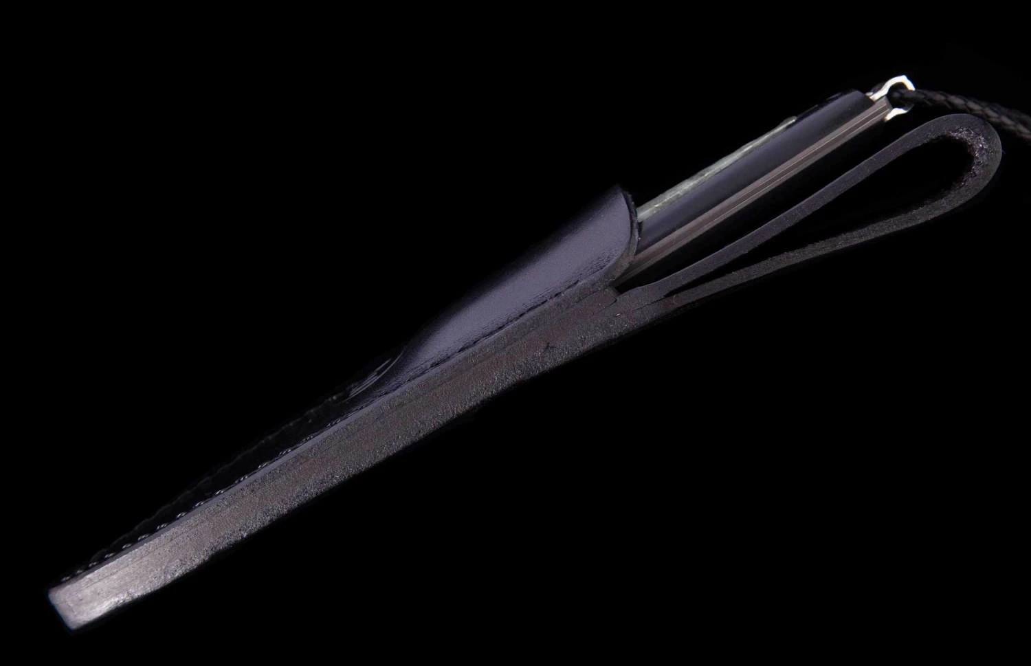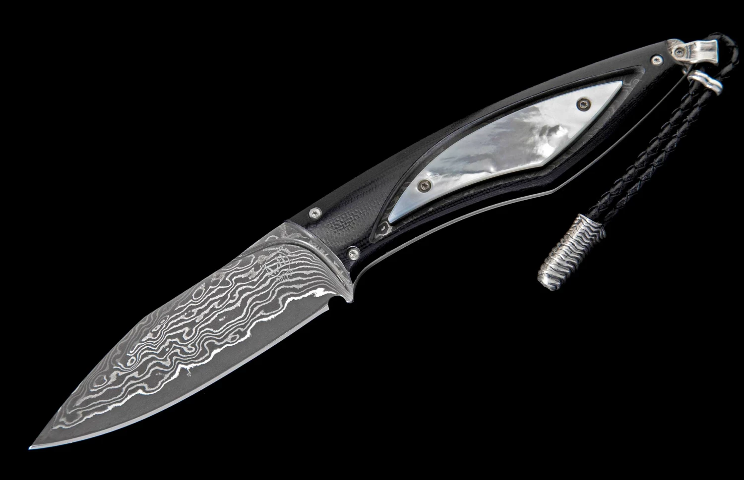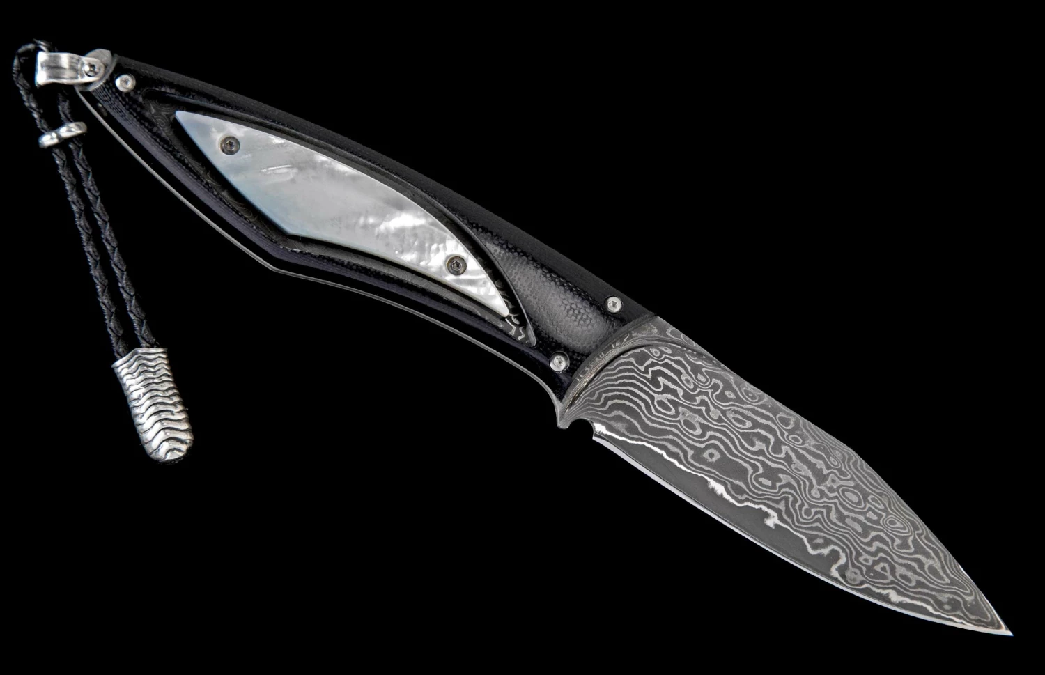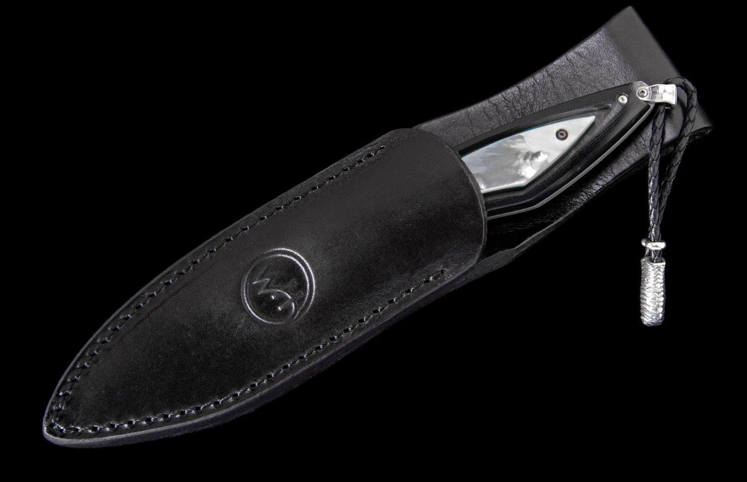 From the depths of the ocean to the palm of your hand. The Coast features the timeless iridescence of Mother of Pearl, the original shell of the mollusk that gives birth to precious pearl beads. Always shifting colored highlights flash against a white backdrop. The pearl inlay is framed in a black G10 composite handle, tough and comfortable. Fully polished by hand, assembled and dissembled multiple times, this architecture has an open channel to see thru to the damascus tang. The blade/tang are forged from 67 layers of three alloys, with a core of VG-10 at HRC 60 for optimal sharpness and wear resistance. Finished with a leather lanyard, sterling silver accents, and includes a sturdy black leather sheath.
