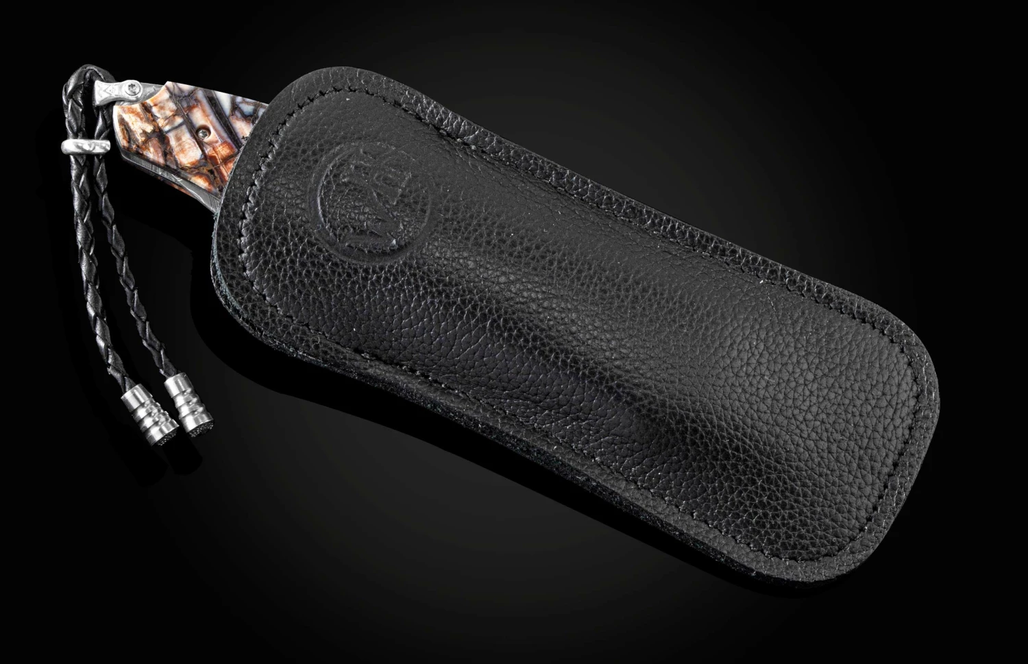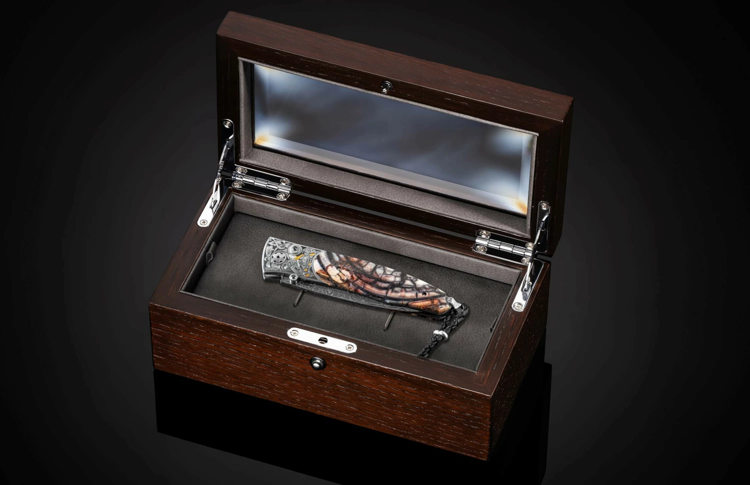 The Gentac ‘Cobra’ features a beautiful hand-engraved frame with 24K gold inlays by Denny Aulia, inlaid with ring-cut 10,000 year-old fossil Woolly Mammoth tusk. The blade is hand-forged ‘Intrepid’ damascus steel by Chad Nichols; the one-hand button lock and the thumb stud are set with spinel gemstones. An exceptional design that offers rigorous performance in a sleek, comfortable knife, the Gentac is also the perfect canvas to showcase William Henry’s range of exotic materials and techniques. The ‘Cobra’ features the superlative artistry, the exotic materials and forged metals that are the hallmark of William Henry’s collections; a distinctive personality statement to be worn and used for a lifetime.