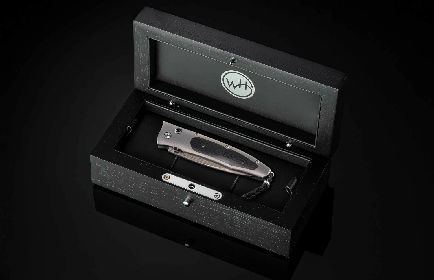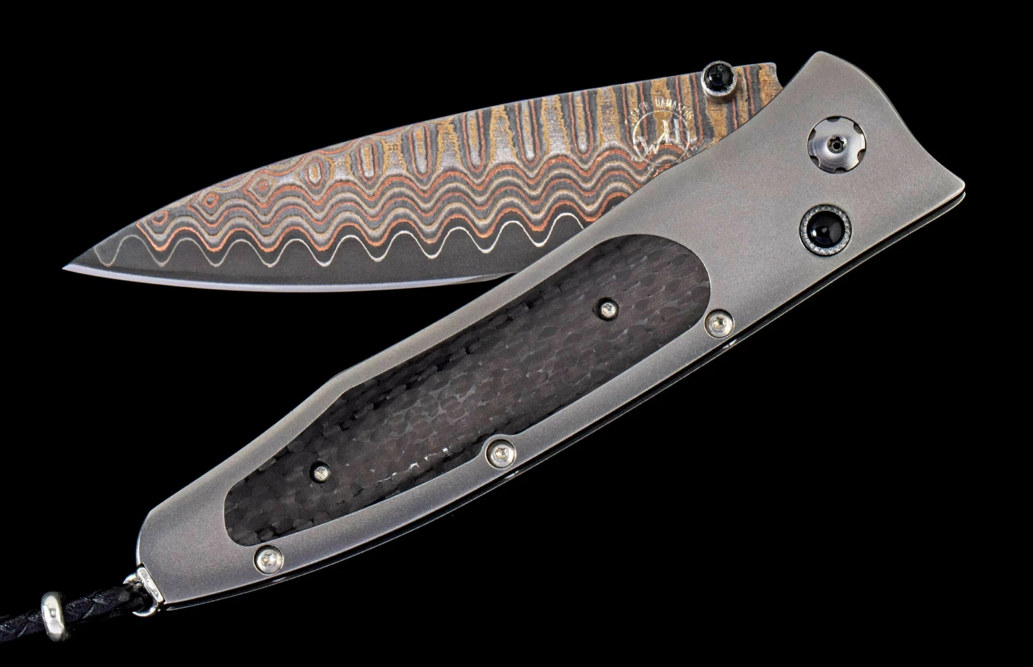 The Gentac ‘Collider’ features a light and resilient frame in brushed finish titanium, inlaid with carbon fiber. The blade is ‘Copper Wave’ damascus with a core of VG5 steel; the one-hand button lock and the thumb stud are set with black onyx gemstones. An exceptional design that offers rigorous performance in a sleek, comfortable knife, the Gentac is also the perfect canvas to showcase William Henry’s range of exotic materials and techniques. The ‘Collider’ features some of the hi-tech materials and hand-forged metals that are the hallmark of William Henry’s collections; a modern design for a timeless heirloom to be proudly worn and used for a lifetime before being handed-down to another generation.