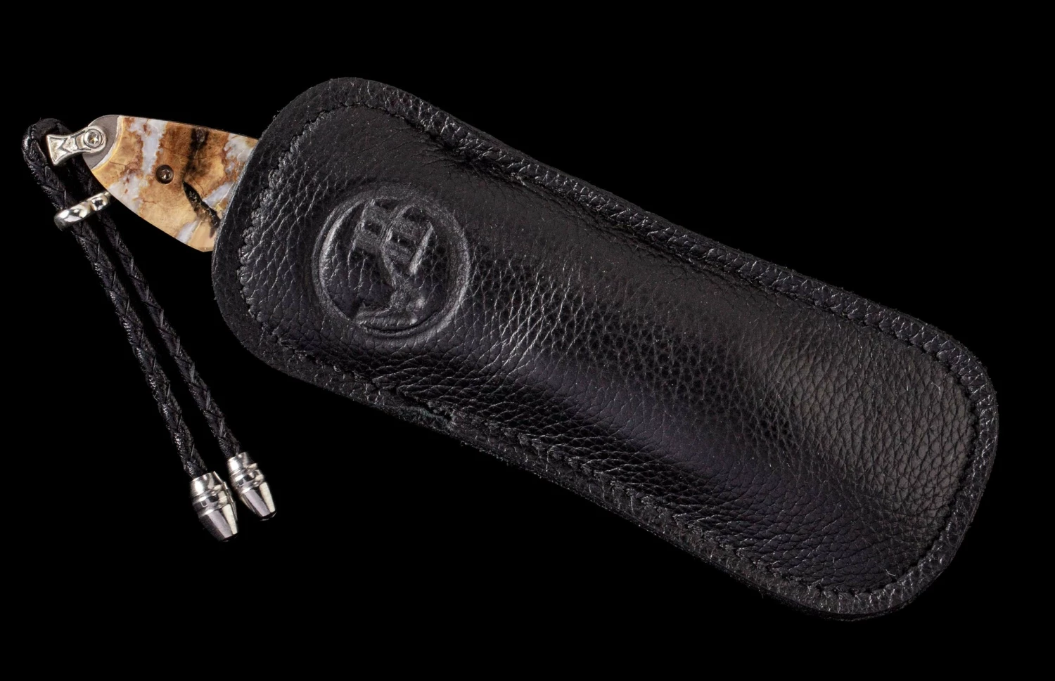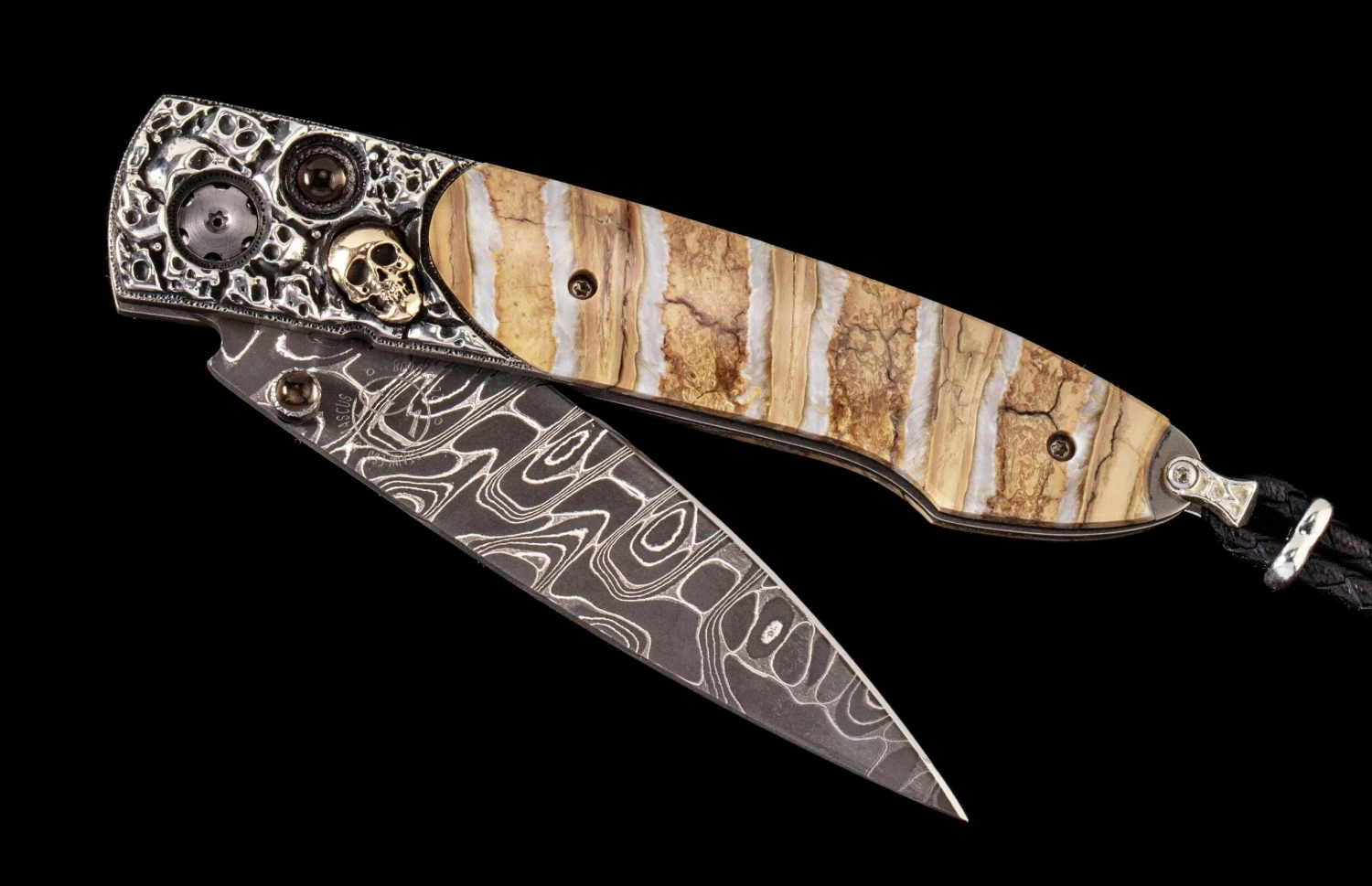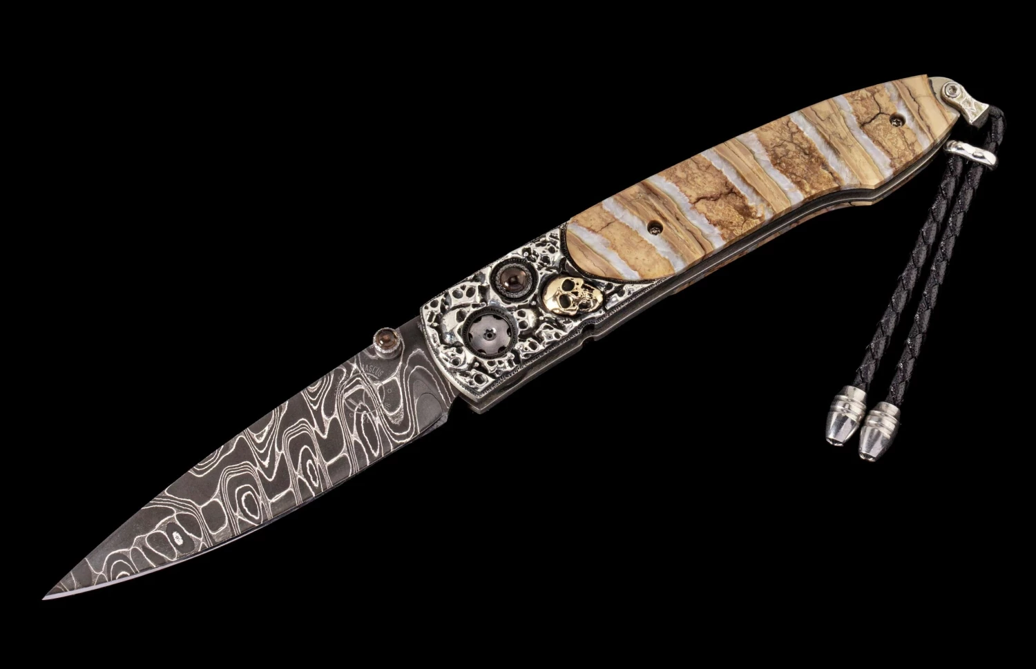 The Lancet ‘Corsiar’ features a beautiful frame in hand-carved sterling silver and gold by Lee Downey, inlaid with mesmerizing 10,000 year-old Woolly Mammoth tooth. The blade is hand-forged ‘Intrepid’ damascus by Chad Nichols; the one-hand button lock and the thumb stud are set with smoky quartz gemstones. Sleek, elegant, refined, and comfortable in the hand and to the eye, the Lancet defines the essential gentleman’s folder in the modern world. The ‘Corsair’ features some of the exotic materials, artistry, and hand-forged metals that are the hallmark of William Henry’s collections.