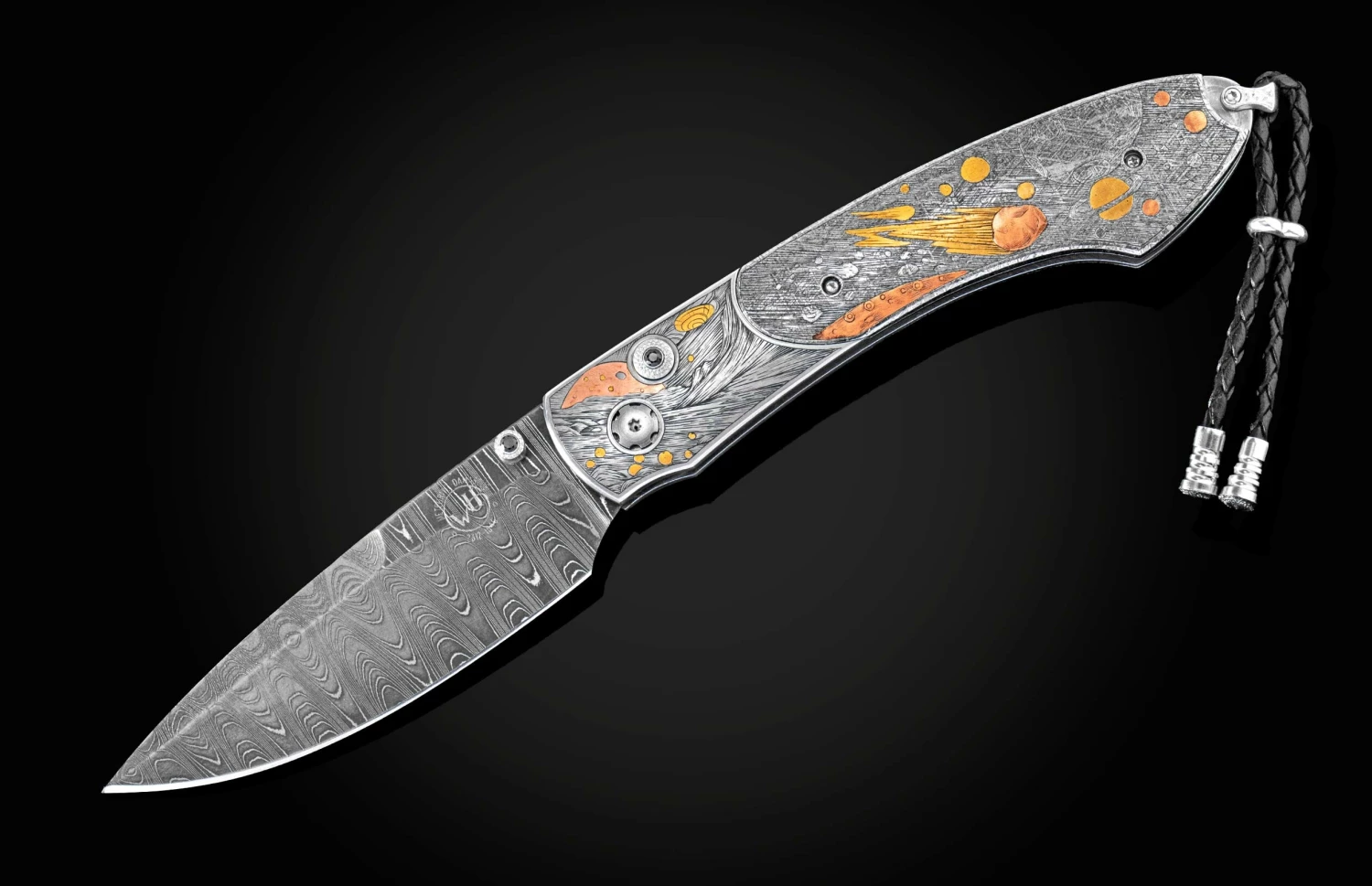The Spearpoint ‘Cosmos II’ features a stainless steel frame, inlaid with Gibeon meteorite scales (a section of the Gibeon meteorite which fell in the desert of Namibia in prehistoric times). Both are hand-engraved with gold and copper inlays by David He. The blade is hand-forged ‘Cosmic’ damascus, by Chad Nichols, which also contains meteorite. The one-hand button lock and thumb stud are set with spinel gemstones.