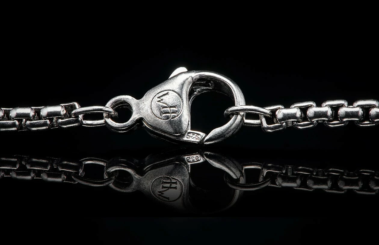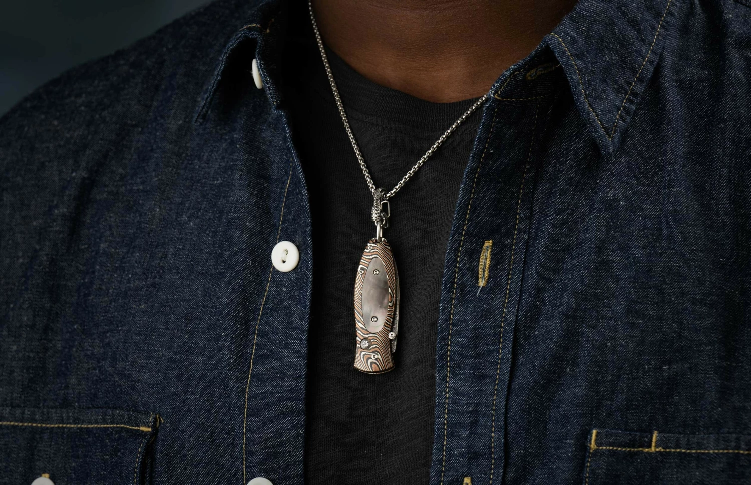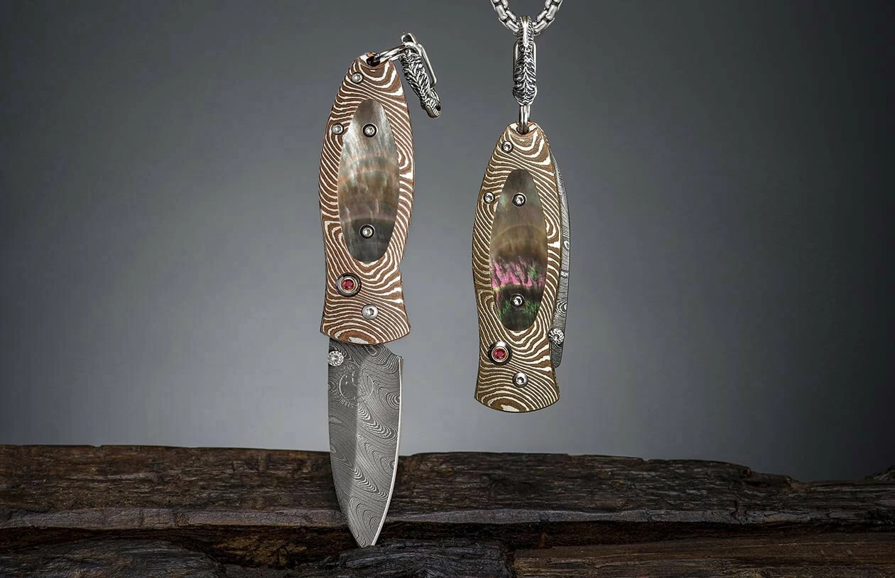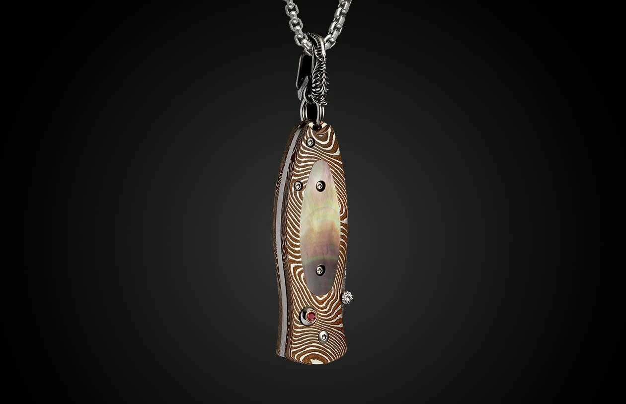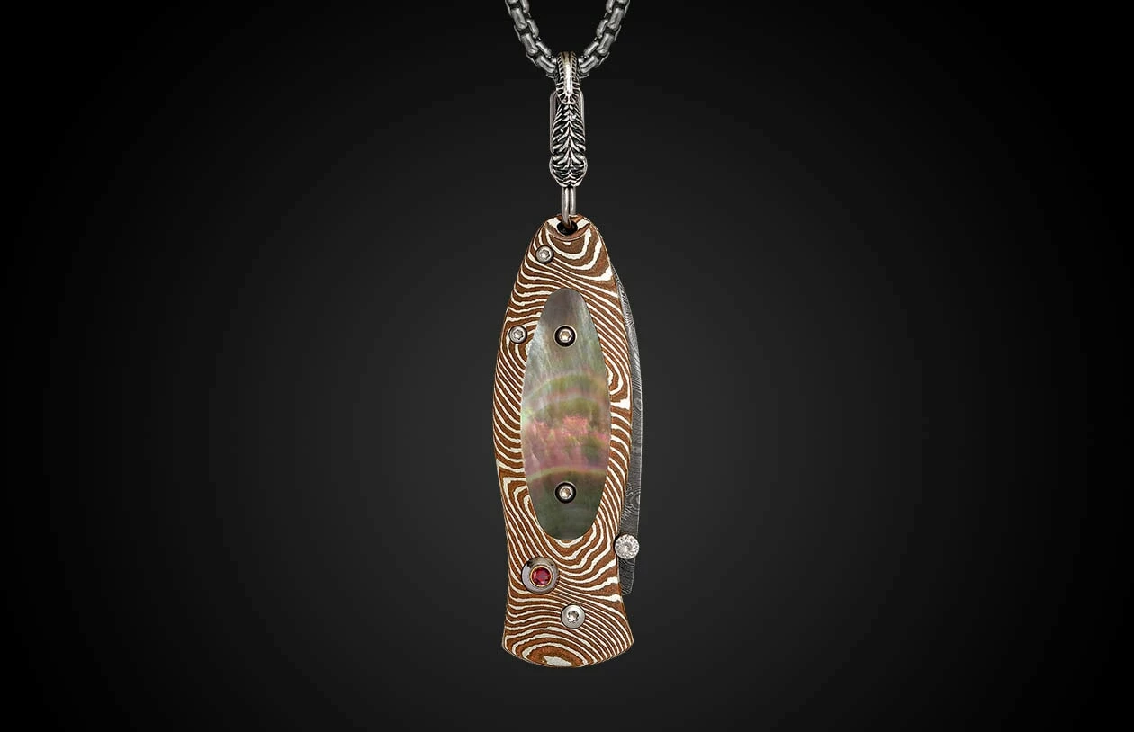 A very limited offering, the Daybreak belongs equally on your neck as a pendant, in your pocket as a keychain knife, or in a museum. Blade is hand-forged stainless damascus steel, and the handle is crafted from hand-forged Mokume Gane inlaid with black lip mother of pearl. Accents of white topaz gemstone, sterling silver, and stainless steel. On a gunmetal finish sterling chain.