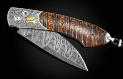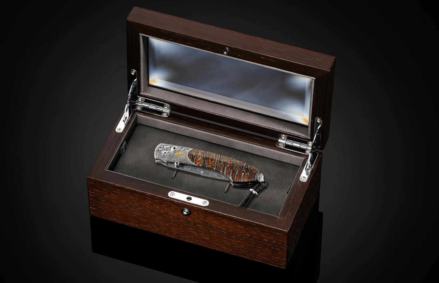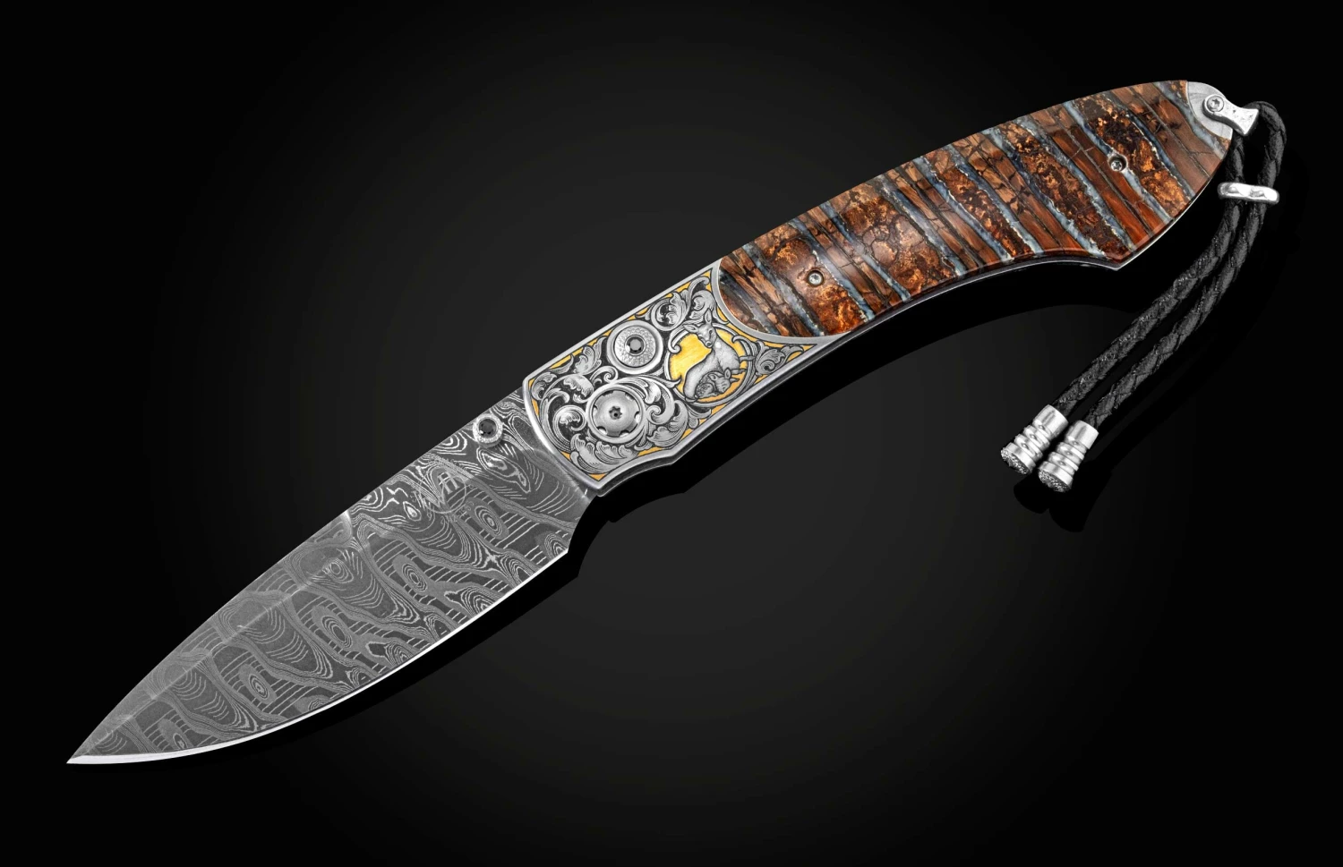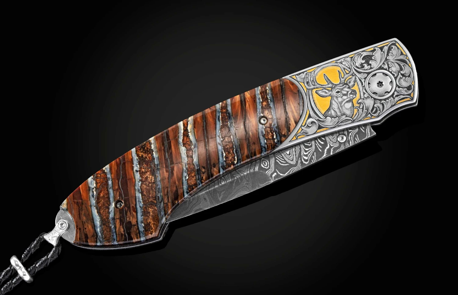 The Spearpoint ‘Deer’ features mesmerizing hand-engraved stainless steel bolsters with 24K gold inlays by Tyler Prince, inlaid with a stunning piece of 10,000 year-old fossil Woolly Mammoth tooth. The blade is hand-forged ‘Hornets Nest’ damascus by Mike Norris; the one-hand button lock and the thumb stud are set with spinel gemstones. A remarkable design that gives you an instrument with a full-size secure grip, and a versatile deep-belly blade, the Spearpoint epitomizes William Henry’s core philosophy – that superlative function deserves to be elevated to superlative art. The ‘Deer’ features some of the most exotic materials, artistry and forged metals that are the hallmark of William Henry’s collections; a timeless heirloom to be proudly worn and used for a lifetime before being handed-down to another generation.