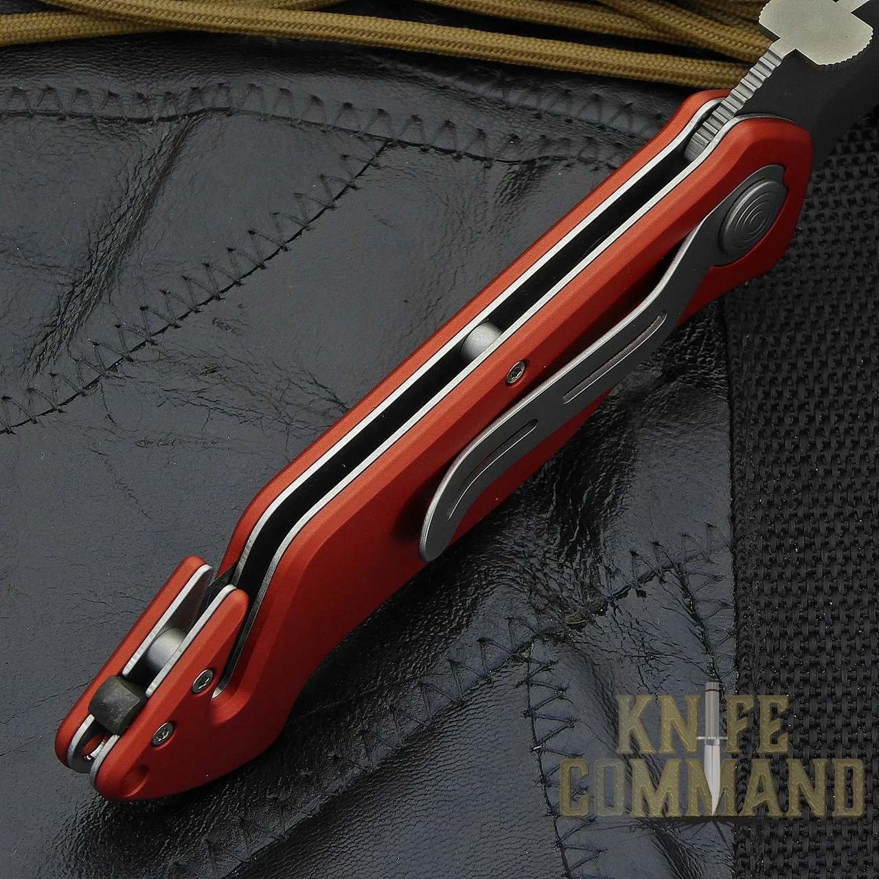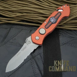 This knife features a matte finish, 3.3″, half serrated, 2.5mm thick, spearpoint blade made from stainless Böhler N695 steel (HRC 58). It is 8.1″ open length, 4.8″ closed. It has a maintenance free, ergonomically designed, all weather handle of red anodized, AIMg3 aluminum. At the butt end, there is a hardened carbide glass breaker mounted just behind an integrated belt cutter with replaceable blade. There are stainless steel liners with a liner lock mechanism. The lock is disengaged by a large button on one side. The blade also has a large thumb disc for easy opening, even when wearing gloves. For carrying, there is a stainless steel pocket clip.