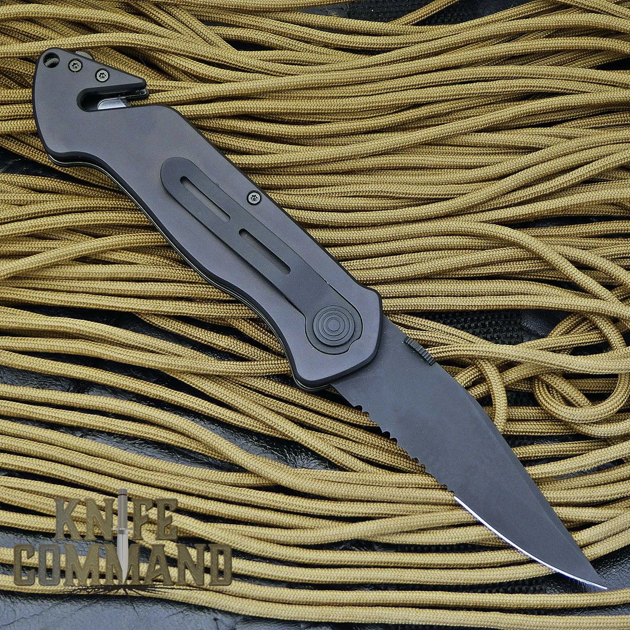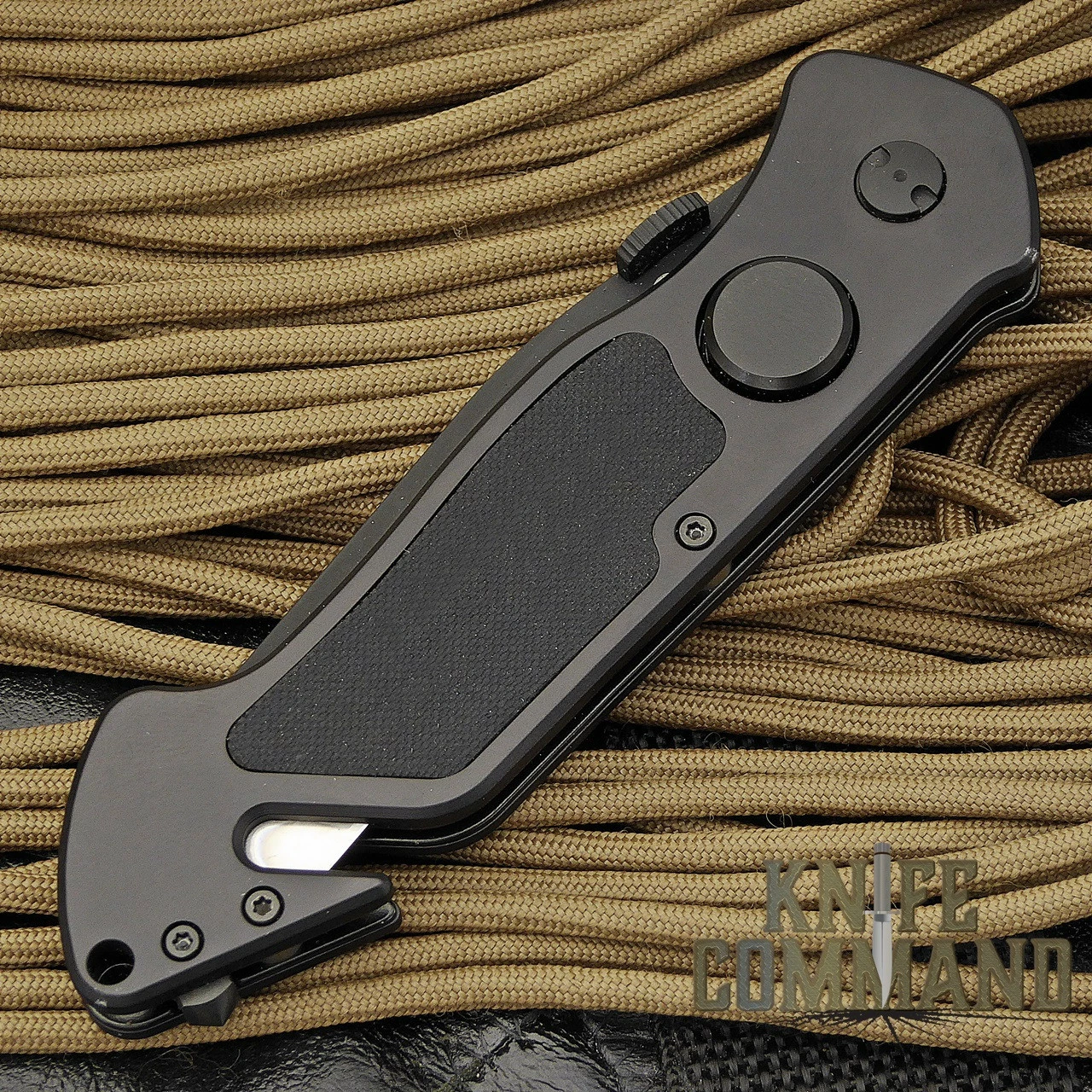This knife features a Black Kal-Gard coated, 3.3″, half serrated, 2.5mm thick, clip point blade made from stainless Böhler N695 steel (HRC 58). It is 8.1″ open length, 4.8″ closed. It has a maintenance free, ergonomically designed, all weather handle of Black anodized, AIMg3 aluminum. At the butt end, there is a hardened carbide glass breaker mounted just behind an integrated belt cutter with replaceable blade. There are black stainless steel liners with a liner lock mechanism. The lock is disengaged by a large black button on one side. The blade also has a large thumb disc for easy opening, even when wearing gloves. For carrying, there is a black stainless steel pocket clip.