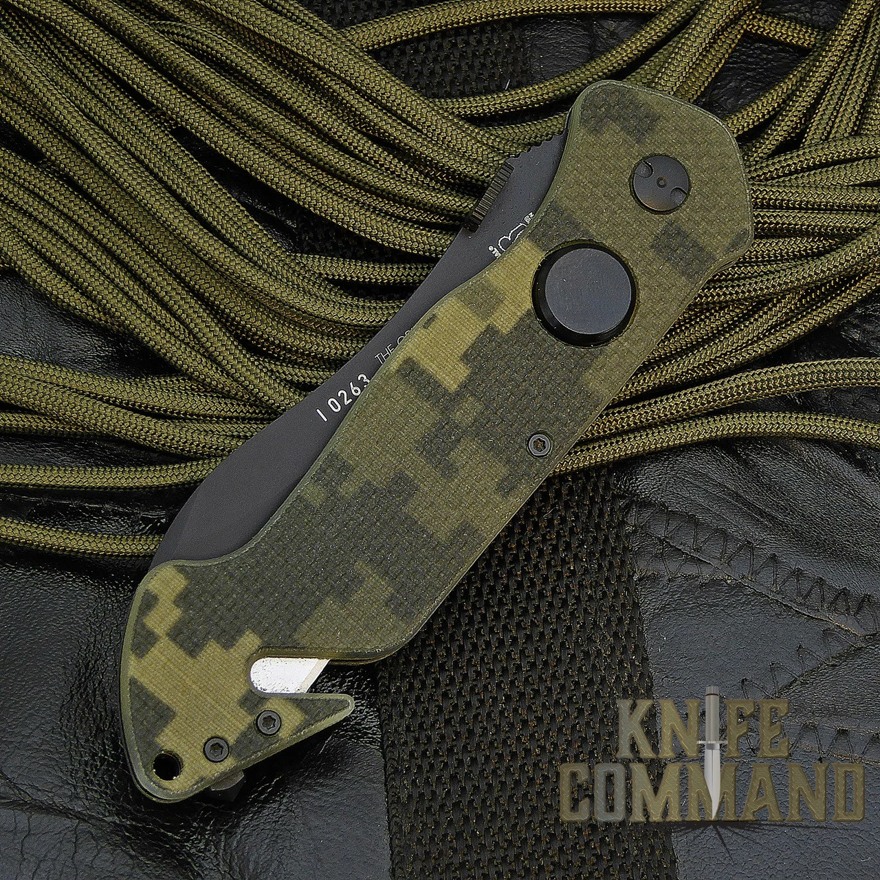 This knife features a Black Kal-Gard coated, 3.3″, half serrated, 2.5mm thick, Spear point blade made from stainless Böhler N695 steel (HRC 58). It is 8.1″ open length, 4.8″ closed. It has a super tough, ergonomically designed, textured handle of Digicam patterned G10. At the butt end, there is a hardened carbide glass breaker mounted just behind an integrated belt cutter with replaceable blade. There are black stainless steel liners with a liner lock mechanism. The lock is disengaged by a large black button on one side. The blade also has a large thumb disc for easy opening, even when wearing gloves. For carrying, there is a black stainless steel pocket clip.