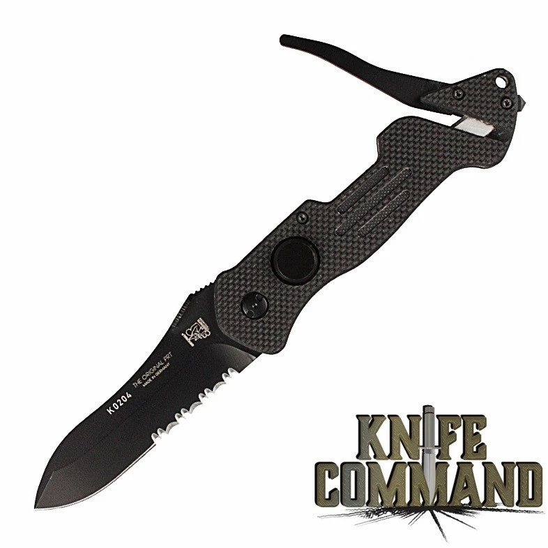 This knife features a Black Kal-Gard coated, 3.3″, half serrated, 2.5mm thick, Spear point blade made from stainless Böhler N695 steel (HRC 58). It is 8.1″ open length, 4.8″ closed. It has a super tough, ergonomically designed, textured handle of Black G10. At the butt end, there is a hardened carbide glass breaker mounted just behind an integrated, lever-action disposable restraint (handcuff) cutter. There are black stainless steel liners with a liner lock mechanism. The lock is disengaged by a large black button on one side. The blade also has a large thumb disc for easy opening, even when wearing gloves. For carrying, there is a black stainless steel pocket clip.