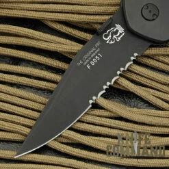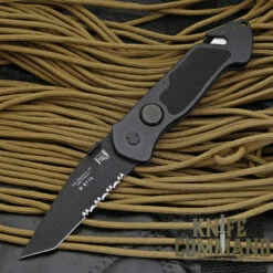 This knife features a Black Kal-Gard coated, 3.3″, half serrated, 2.5mm thick, Tanto point blade made from stainless Böhler N695 steel (HRC 58). It is 8.1″ open length, 4.8″ closed. It has a maintenance free, ergonomically designed, all weather handle of Black anodized, AIMg3 aluminum. At the butt end, there is a hardened carbide glass breaker mounted just behind an integrated belt cutter with replaceable blade. There are black stainless steel liners with a liner lock mechanism. The lock is disengaged by a large black button on one side. The blade also has a large thumb disc for easy opening, even when wearing gloves. For carrying, there is a black stainless steel pocket clip.