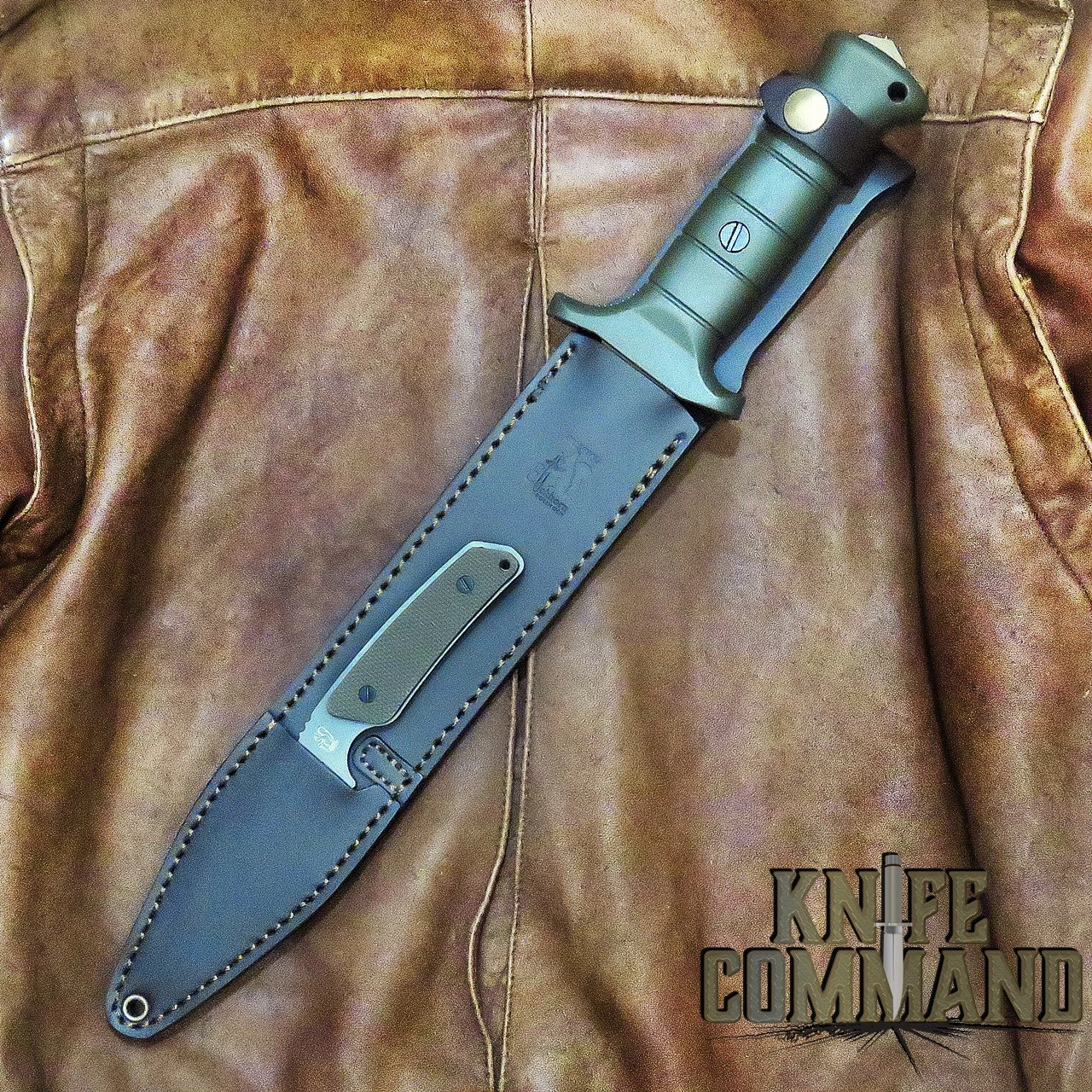 The Boar Hunter is approximately 15-3/8″ in overall length with a 10.2″ blade and weighs 12.2 ounces. The Beryllium coated blade is Eickhorn Professional stainless steel for easy penetration and disinfecting. The blade is a double edged, hollow ground, dagger design with both fine cutting edges. Each knife is hand sharpened and individually serial numbered. The maintenance free, ergonomically designed Olive Green all weather handle grip is made to MIL specifications. It is a glass-fiber reinforced polyamide handle with an exposed tang at handle end for glass breaking.