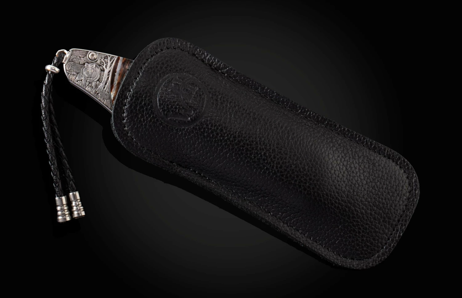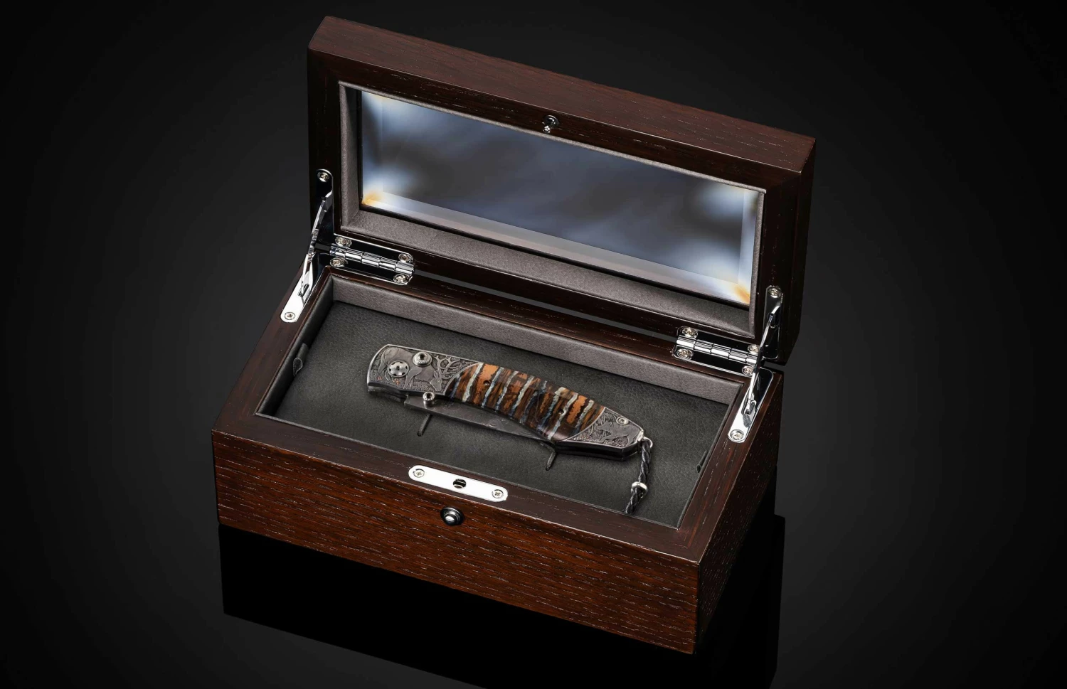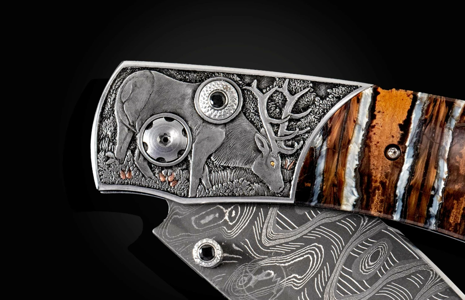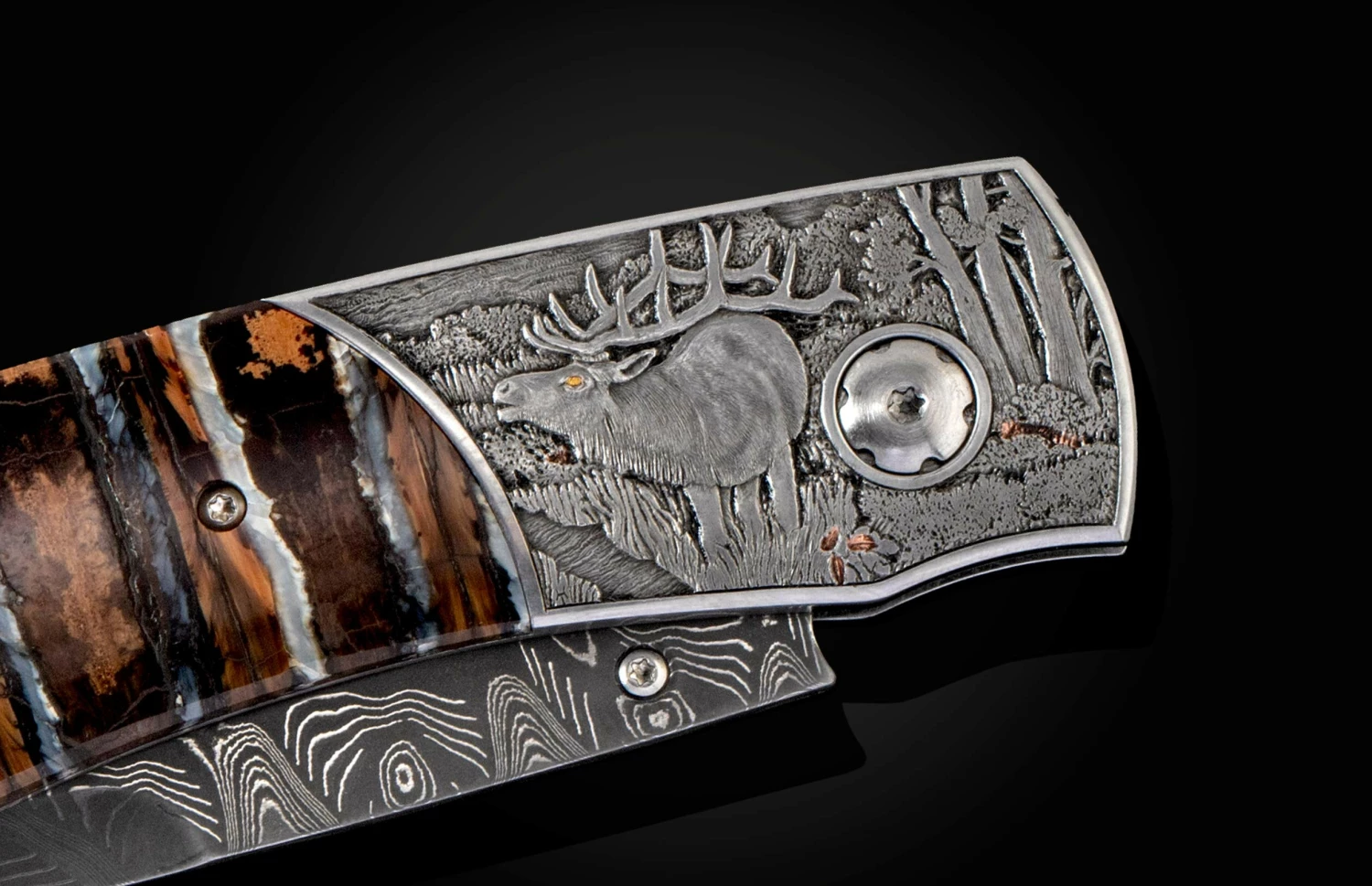 The Spearpoint ‘Elk Hunt’ features a mesmerizing hand-engraved bolster with 24K gold and copper inlays by Howard Thomas, inlaid with a stunning piece of 10,000 year-old fossil Woolly Mammoth tooth. The blade is hand-forged ‘Hornet’s Nest’ damascus by Mike Norris; the one-hand button lock and the thumb stud are set with spinel gemstones. A remarkable design that gives you an instrument with a full-size secure grip, and a versatile deep-belly blade, the Spearpoint epitomizes William Henry’s core philosophy – that superlative function deserves to be elevated to superlative art. The ‘Elk Hunt’ features some of the most exotic materials, artistry and forged metals that are the hallmark of William Henry’s collections; a timeless heirloom to be proudly worn and used for a lifetime before being handed-down to another generation.