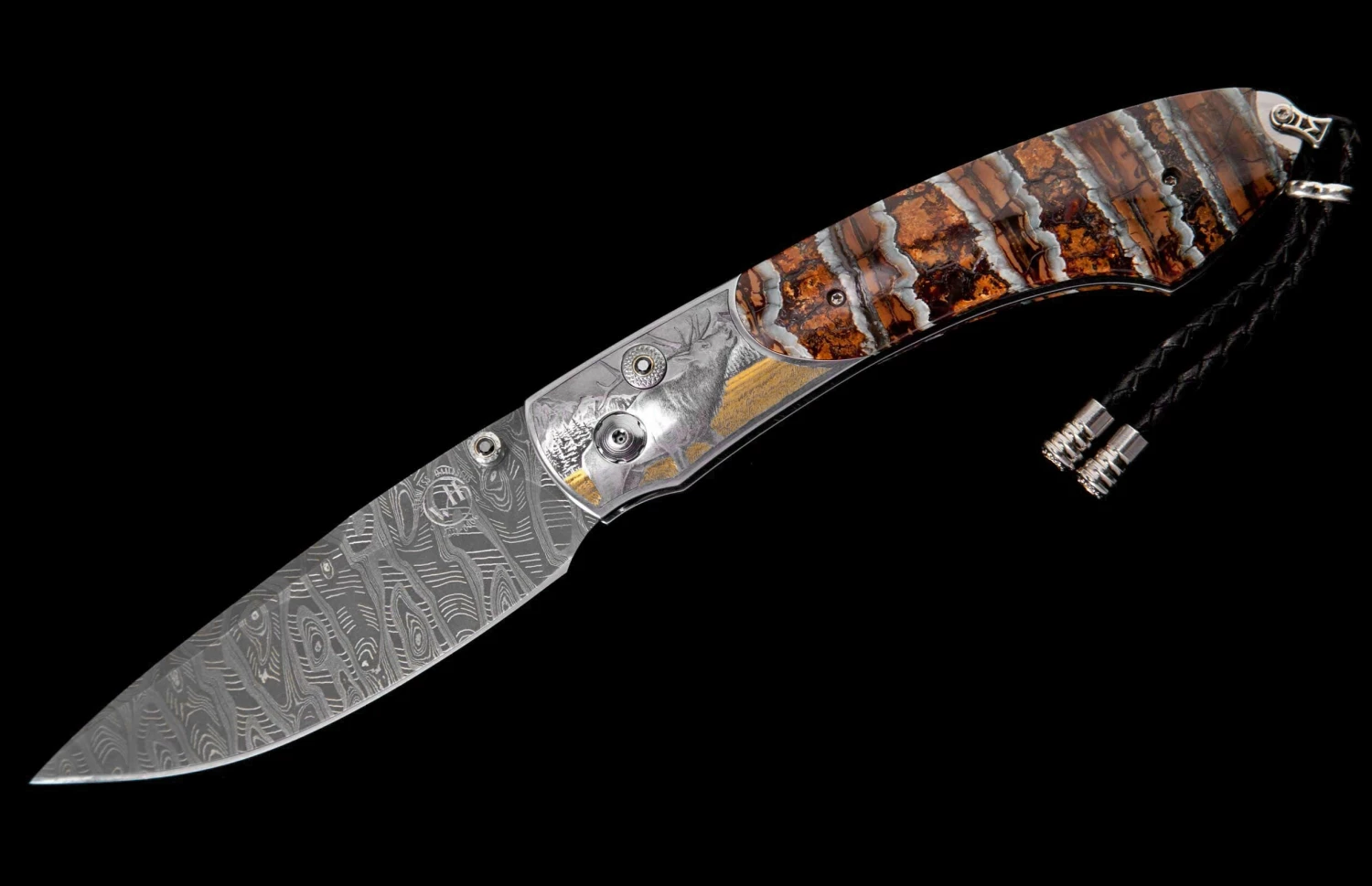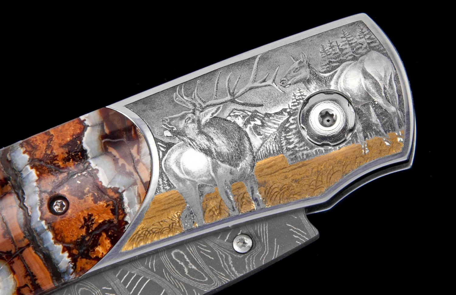 The Spearpoint ‘Elk II’ features a beautiful hand-engraved frame with 24K gold inlays by Matyas Balazs, inlaid with a stunning piece of 10,000 year-old fossil Woolly Mammoth tooth. The blade is hand-forged Hornets Nest’ damascus by Mike Norris; the one-hand button lock and the thumb stud are set with spinel gemstones. A remarkable design that gives you an instrument with a full-size secure grip, and a versatile deep-belly blade, the Spearpoint epitomizes William Henry’s core philosophy – that superlative function deserves to be elevated to superlative art. The ‘Elk II’ features the superlative artistry, and hand-forged metals that are the hallmark of William Henry’s collections; a timeless heirloom to be proudly worn and used for a lifetime before being handed-down to another generation.