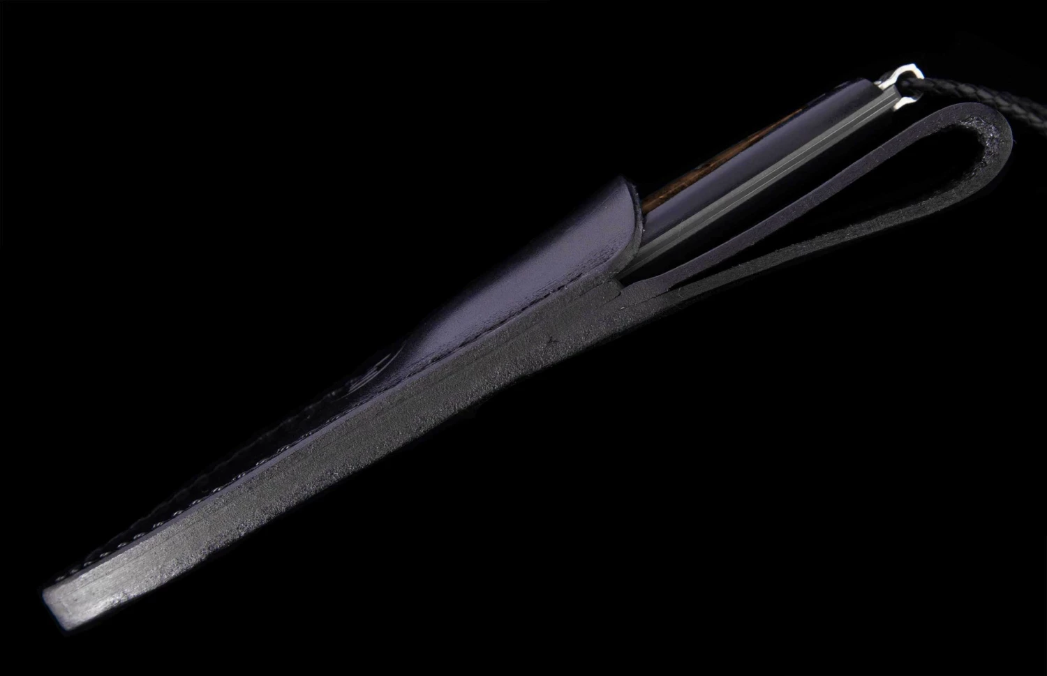 History in the palm of your hand… The “Epic’ features gorgeous inlays crafted from wooly mammoth tooth, from the now extinct legend, ranging from 6000-10000 years old. This rare and storied material is set into a window in a black G10 composite handle which is durable and comfortable. Fully polished by hand, assembled and dissembled multiple times, this striking handle has an open channel to see thru to the damascus tang. The blade/tang are forged from 67 layers of three alloys, with a core of VG-10 at HRC 60 for optimal sharpness and wear resistance. Finished with a black leather lanyard, sterling silver accents, and includes a sturdy black leather sheath. Own and carry a piece of history!