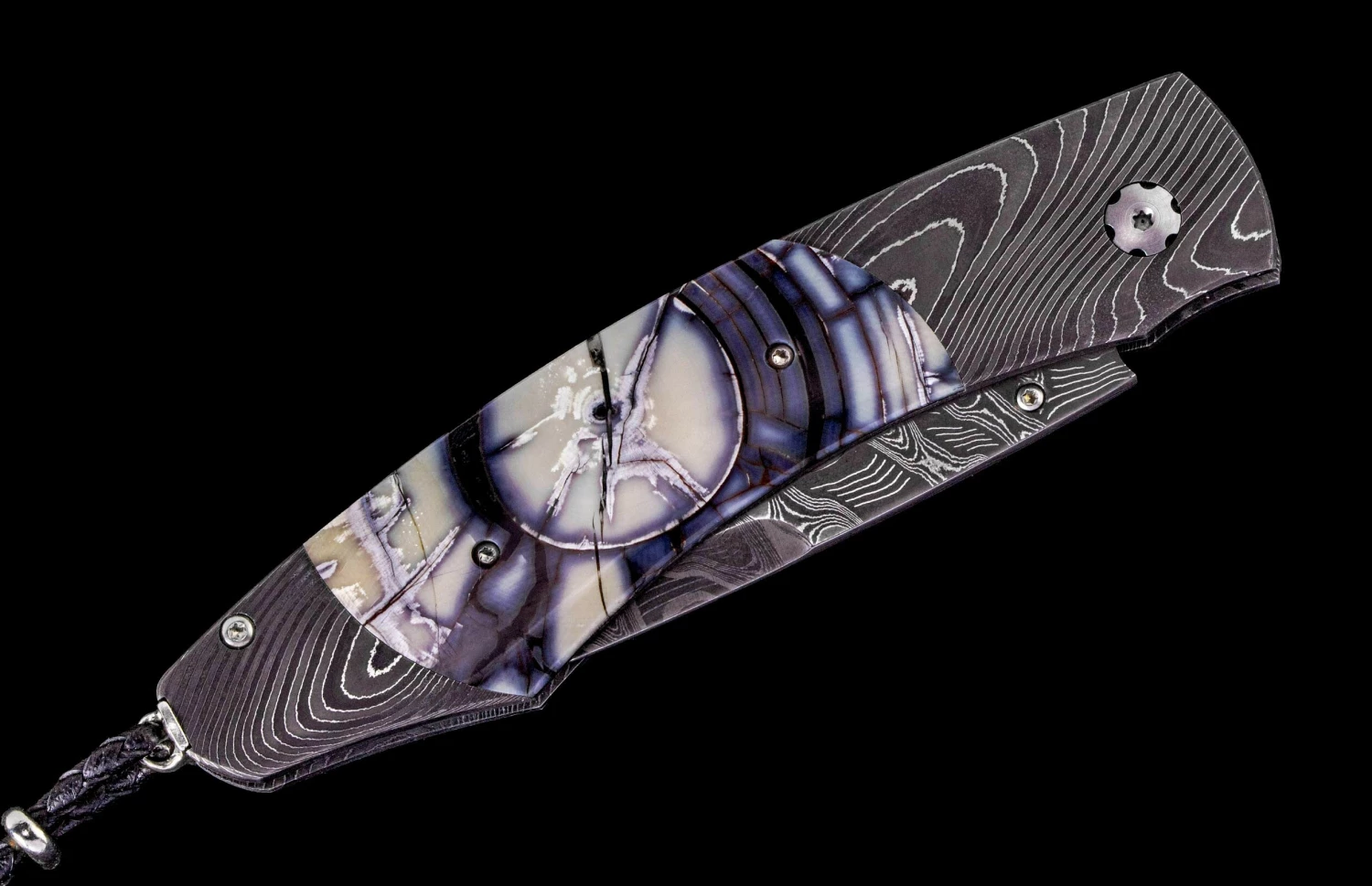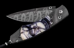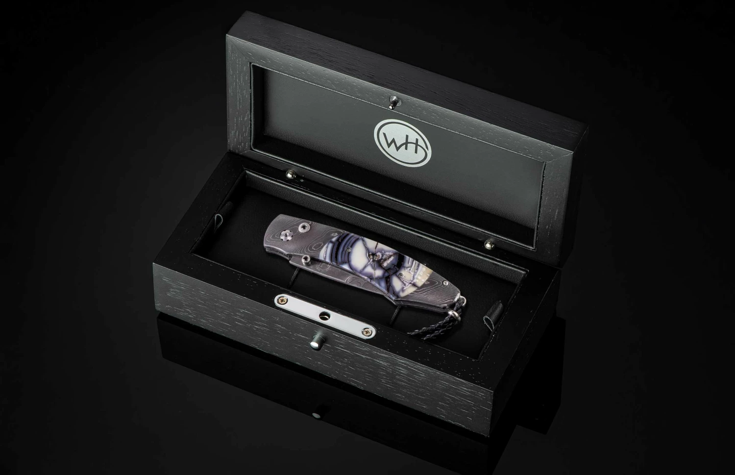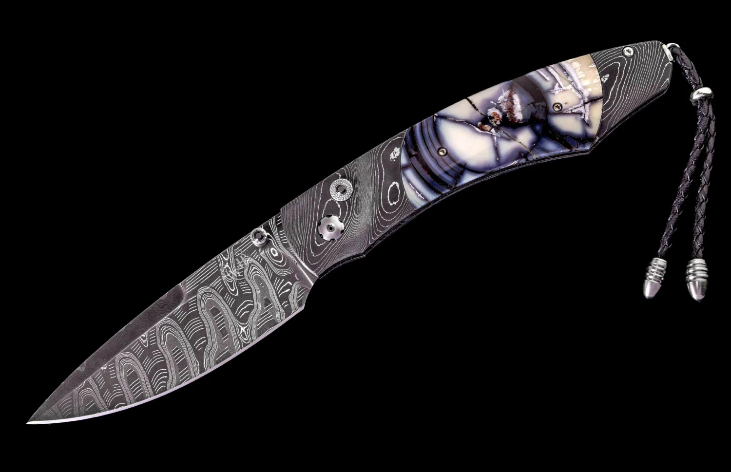 The Spearpoint ‘Epic Night’ features a beautiful frame in hand-forged, etched ‘Twist’ damascus by Chad Nichols, inlaid with the ring-cut of 10,000 year-old fossil Woolly Mammoth tusk. The blade is ‘Hornets Nest’ damascus by Mike Norris; the one-hand button lock and the thumb stud are set with spinel gemstones. A remarkable design that gives you an instrument with a full-size secure grip, and a versatile deep-belly blade, the Spearpoint epitomizes William Henry’s core philosophy: that superlative function deserves to be elevated to superlative art. The ‘Epic Night’ features some of the exotic materials, and forged metals that are the hallmark of William Henry’s collections; a timeless heirloom to be proudly worn and used for a lifetime before being handed-down to another generation.
