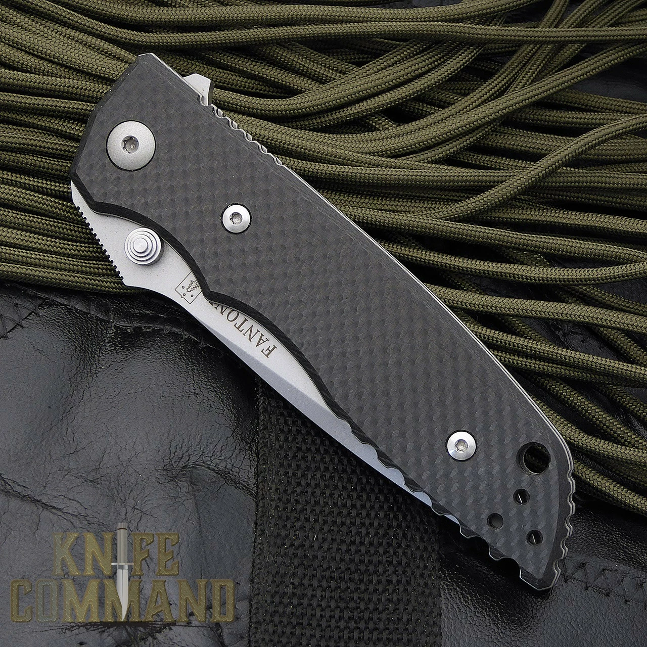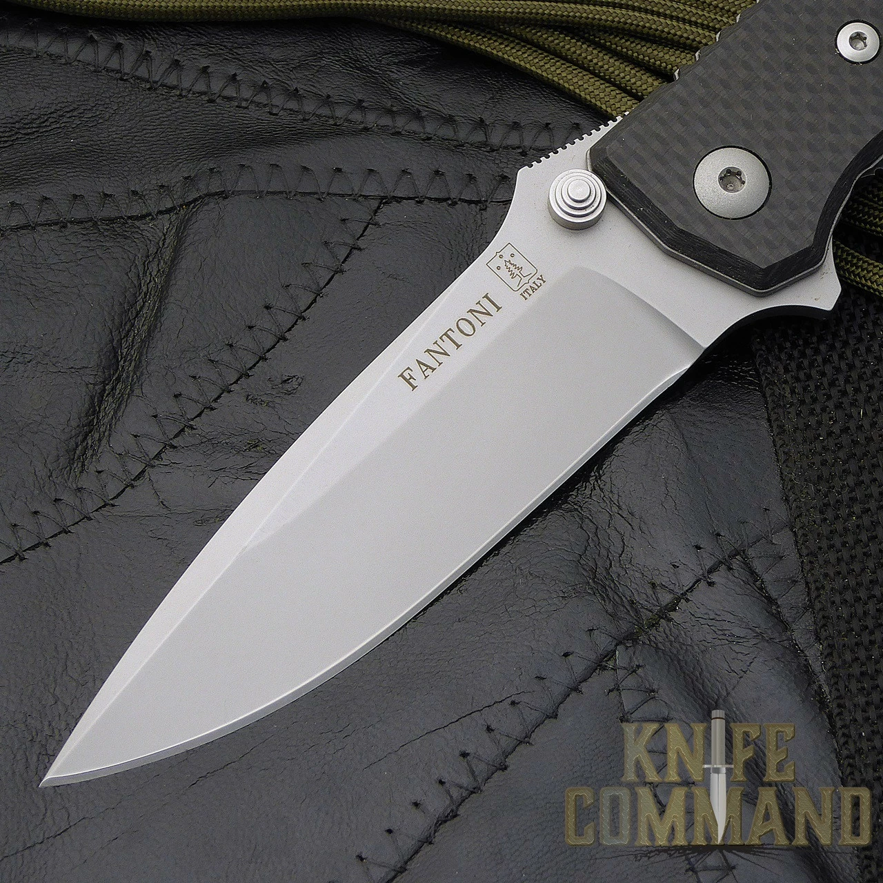 The HB 01 is the largest of the Fantoni made Harsey series of folders. The 4-1/4″ spearpoint blade mates perfectly with the black Carbon Fiber handle to make an impressive 9-1/2″ overall knife. The blade is of a satin like, bead blast finished Bohler M390 Microclean stainless steel hardened to a Rockwell 61-62. It has dual thumbstuds and a flipper tang to assist in rapid deployment. The handle is made of finely textured Carbon Fiber scales over 6AI4V titanium liners. The titanium pocket clip is reversible for either right or left hand, tip-up carry. The HB 01 has an open column design for easy cleaning and has a ribbed thumb ramp and jimping on the handle back, butt and underneath for a secure grip.