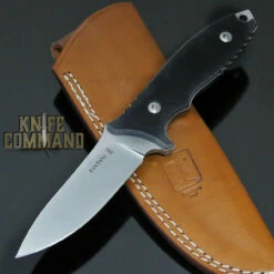 The HB Fixed Blade is 8″ in overall length. It has a 3.9mm thick, 3-1/2″ long, CPM-S35VN stainless steel blade, HRC 61-62 with a fine cutting edge. The full tang blade has a scratch resistant stone-washed finish. For safety and security it features an integral finger guard, fine textured Black G-10 handles, a ribbed thumb ramp and jimping underneath. The exposed tang has a lanyard hole. The weight is about 4.3 ounces.