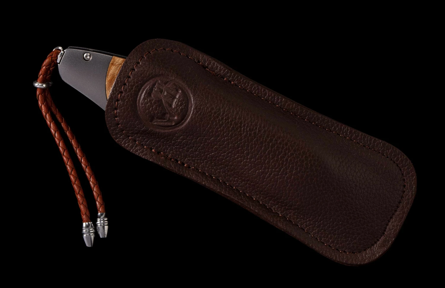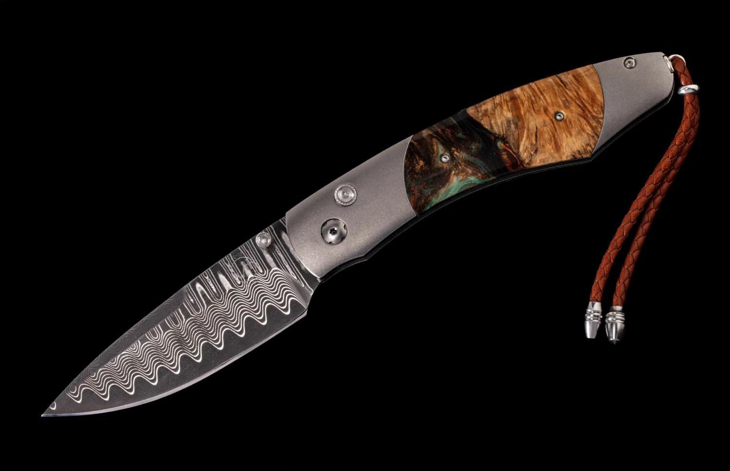 The Spearpoint ‘Fire and Ice’ features a frame in aerospace-grade titanium, inlaid with a spectacular ‘hybrid’ of natural wood and colored resin. The blade is ‘Wave’ damascus with an extra strong core of VG-10; the one-hand button lock and the thumb stud are set with white topaz gemstones. A remarkable design that gives you an instrument with a full-size secure grip, and a versatile deep-belly blade, the Spearpoint epitomizes William Henry’s core philosophy – that superlative function deserves to be elevated to superlative art. The ‘Fire and Ice’ features some of the exotic materials and hand-forged metals that are the hallmark of William Henry’s collections; a distinctive personality statement to be worn and used for a lifetime.