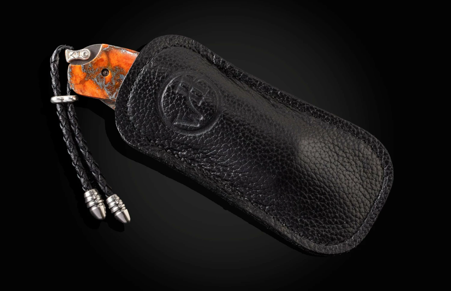 The Kestrel ‘Flash Fire’ features a frame in aerospace-grade titanium, inlaid with a beautiful piece of zinc-matrix apple coral. The blade is ‘Copper ‘Wave’ damascus with an extra strong core in VG-5; the one-hand button lock and the thumb stud are set with white topaz gemstones. An exceptional design that offers rigorous performance in a sleek, comfortable knife, the Kestrel is also the perfect canvas to showcase William Henry’s range of exotic materials and techniques. The ‘Flash Fire’ features some of the exotic materials and hand-forged metals that are the hallmark of William Henry’s collections; a timeless heirloom to be proudly worn and used for a lifetime before being handed-down to another generation.