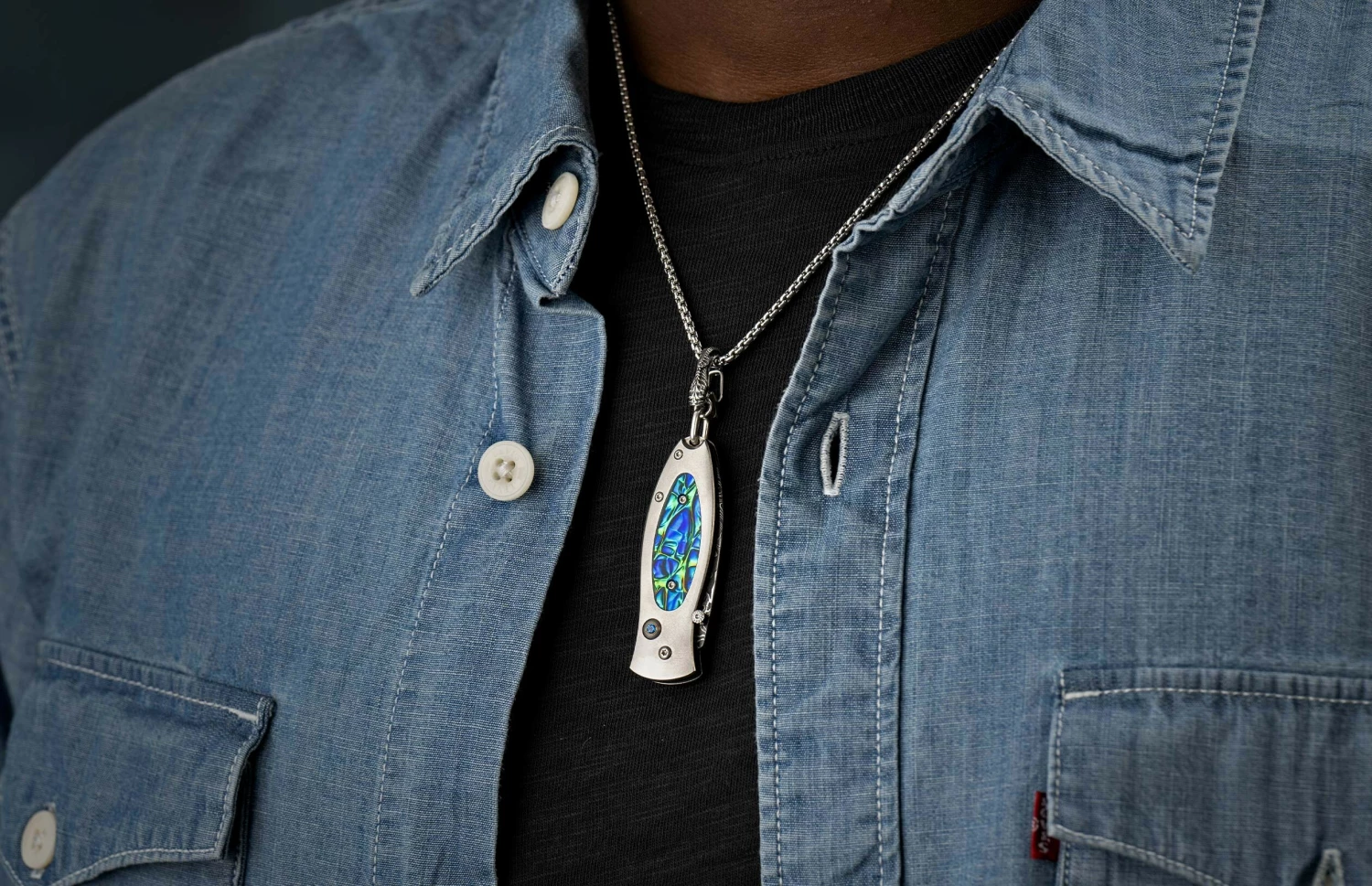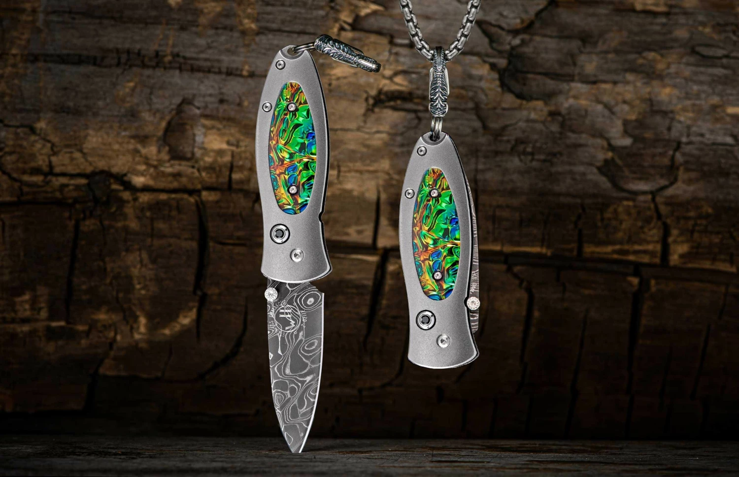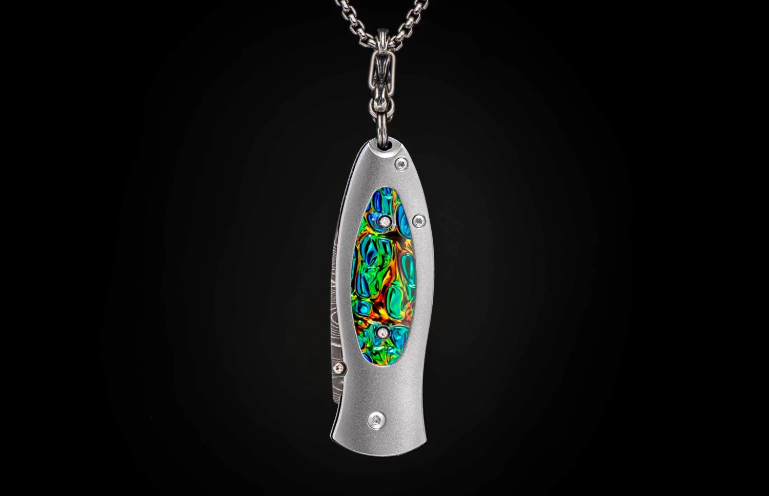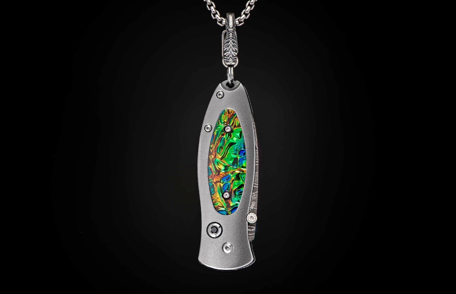 The Morpheus ‘Flash’ belongs equally on your neck as a pendant, in your pocket as a keychain knife, or on display as a beautiful piece of functional art. The blade is crafted using hand-forged ‘Intrepid’ damascus steel by Chad Nichols, and the handle is crafted from aerospace-grade titanium inlaid with Black Sea Dichrolam®. This fine knife also features a spinel gemstone and black PVD coated bronze chain. A fine, functional, and timeless William Henry creation.