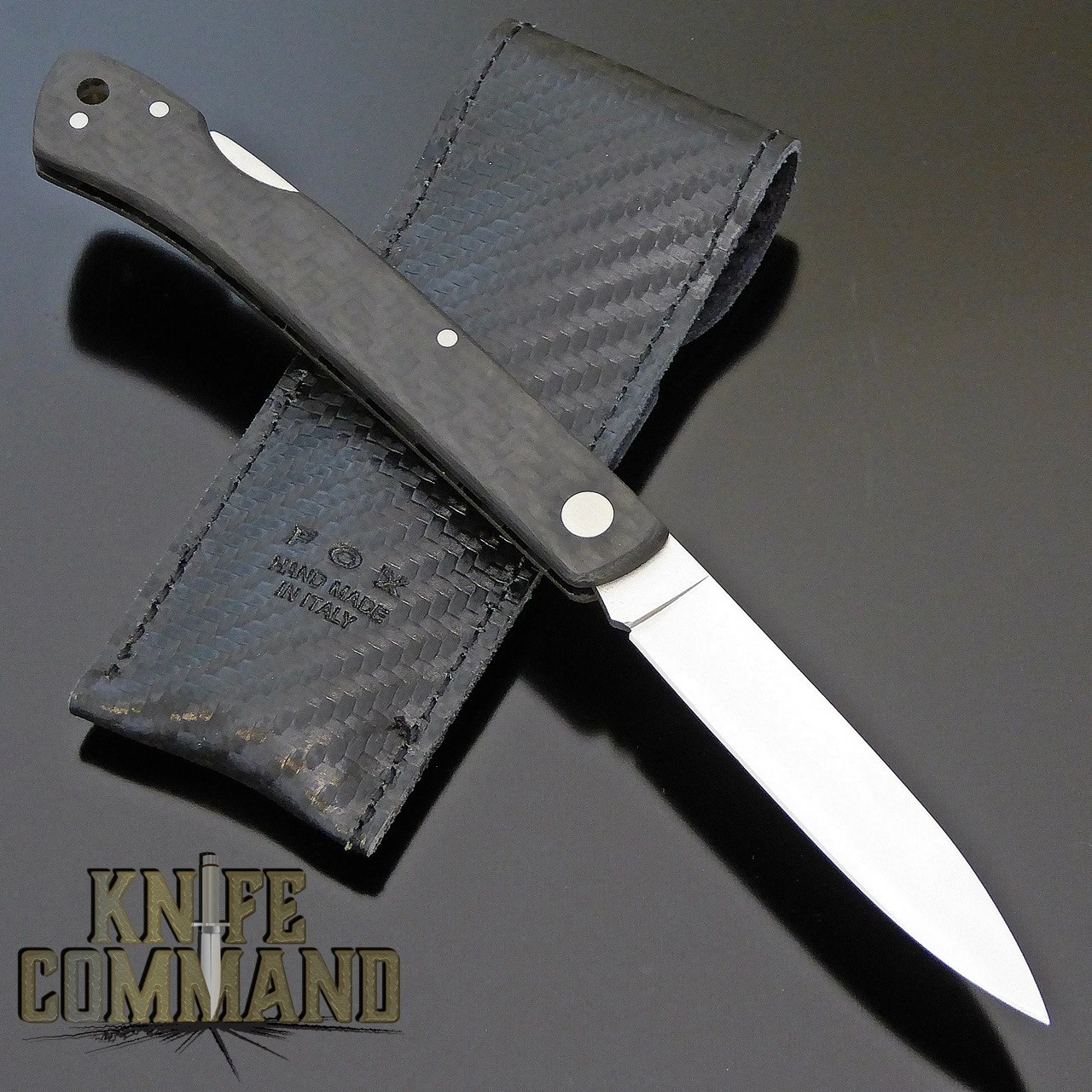 The 573CF is great for EDC. It measures 6-3/4″ open length, 3-5/8″ closed length, and weighs only .95 oz. The .08″ thick, drop-point blade is 2-3/4″ long and is hollow ground 440C stainless steel with a 55-57 Rockwell hardness. A traditional nail nick is used for easy opening and the black Carbon Fiber handle has a rear end lock back design to keep the blade securely open. A black carbon fiber styled leather pocket pouch is included. This 573CF is brand new in original Fox box.