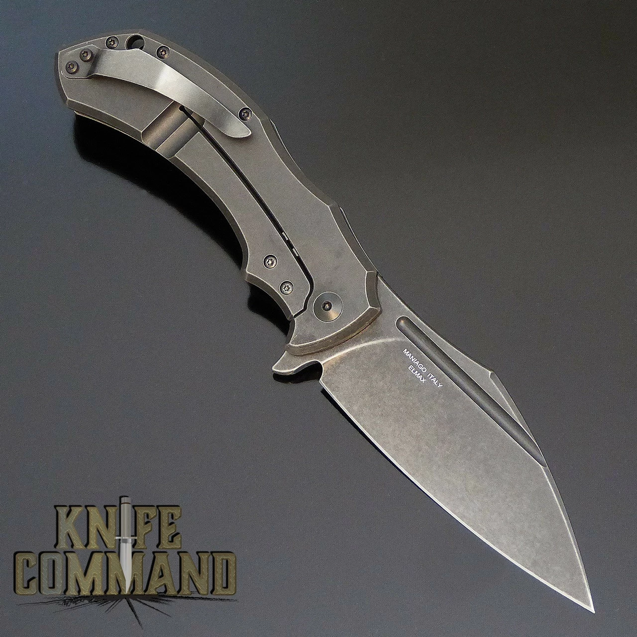 The Shadow Ti measures 8-5/8″ open length, 4-3/4″ closed length, and weighs only 5.55 oz. The 4mm thick, black stonewash finished blade is 3-7/8″ long and is forged from Elmax stainless steel. A flipper tang and ball bearing pivot allow for easy one-hand opening. The Titanium framelock handle features a contoured Titanium scale on front with a lanyard hole and a pocket clip. The Shadow comes with a fine black leather zippered pouch and is brand new in original Fox box.