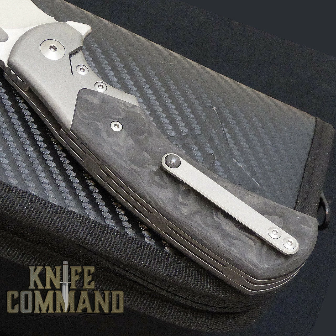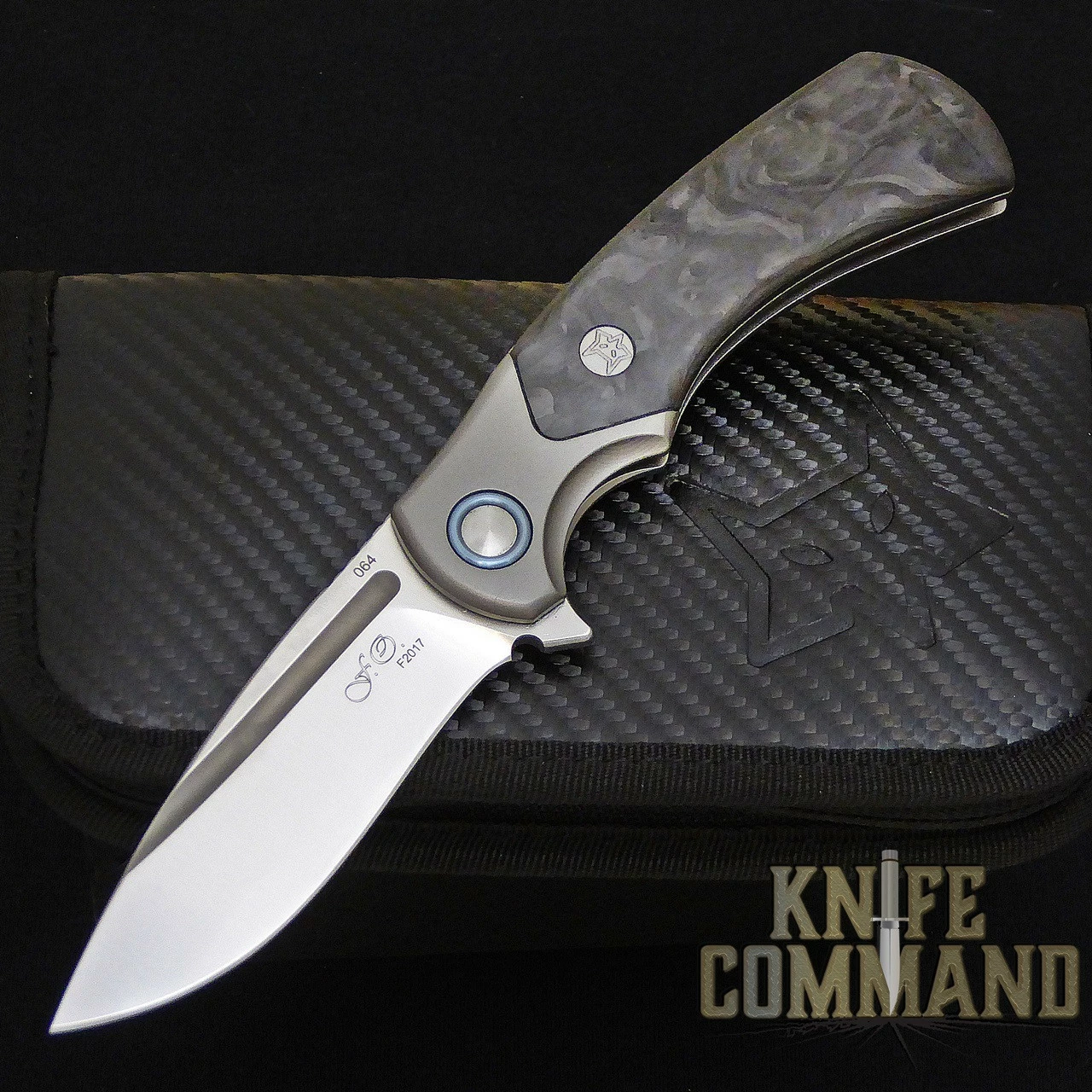 The F2017 measures 7-1/2″ open length, 4-3/8″ closed length, and weighs only 4.25 oz. The 3.5mm thick, satin finished, drop-point blade is 3-1/4″ long and is forged from Böhler powder metallurgical M390 stainless steel with a 60-62 Rockwell hardness. A flipper tang and ball bearing pivot allow for easy one-hand opening. The handle features a titanium frame with integral bolsters. The Wild Carbon Fiber handle scales in random patterns make each knife an individual. Keeping the blade safely open is the new Bolster Lock which is a sophisticated version of the framelock. The F2017 features a ventilated Titanium back spacer and a Titanium pocket clip. This gorgeous folder comes brand new in its original Fox box with a very nice, black leather zippered Fox knife case. Each knife is individually serial numbered.