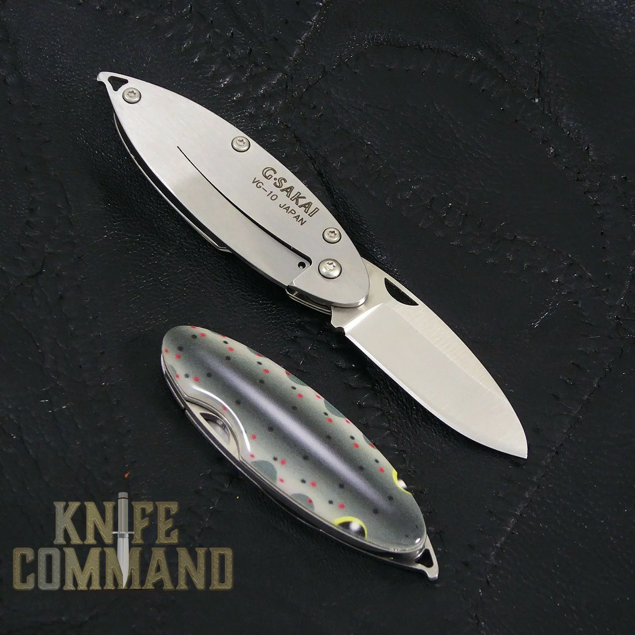 The G Sakai keychain knives are modeled after the fish of the Nagara River in Japan. The Amago fish is the silvery, spotted fish. The Ayu is the green and yellow fish, looking almost like a frog here.