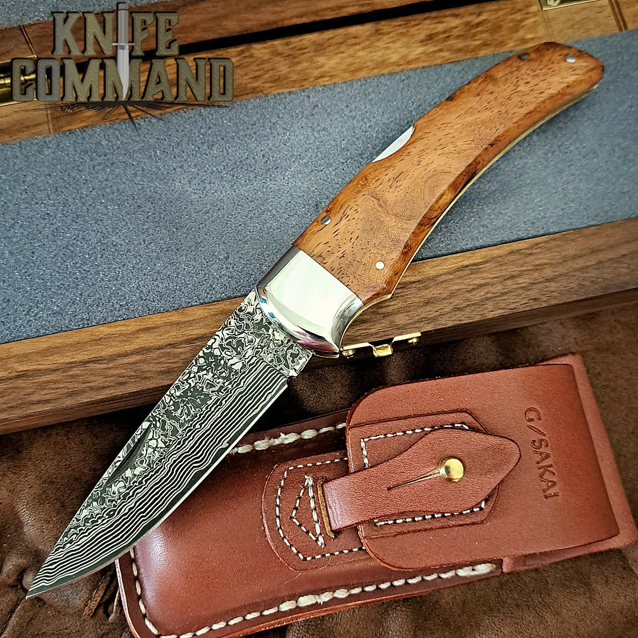 Included is a high quality leather belt sheath which is embossed with G. Sakai name on the cover flap. The cover flap is held closed with large brass pin and slotted leather lock-flap. To top it off, this package comes complete with a 12x4x2-3/4 wooden presentation box with padded interior, hinged lid with brass latch.