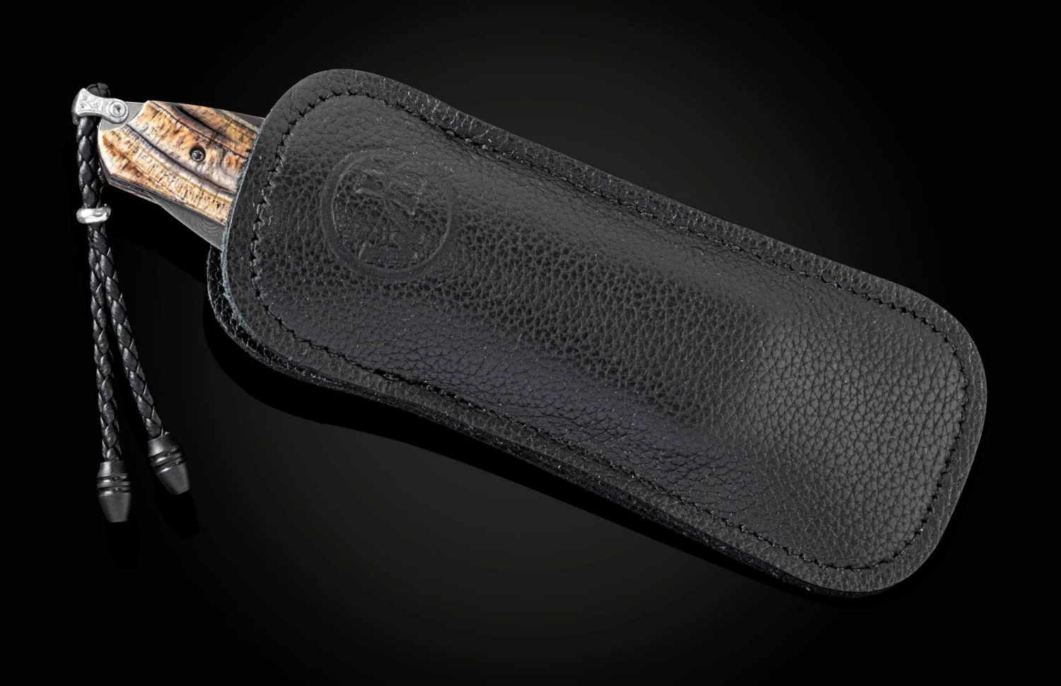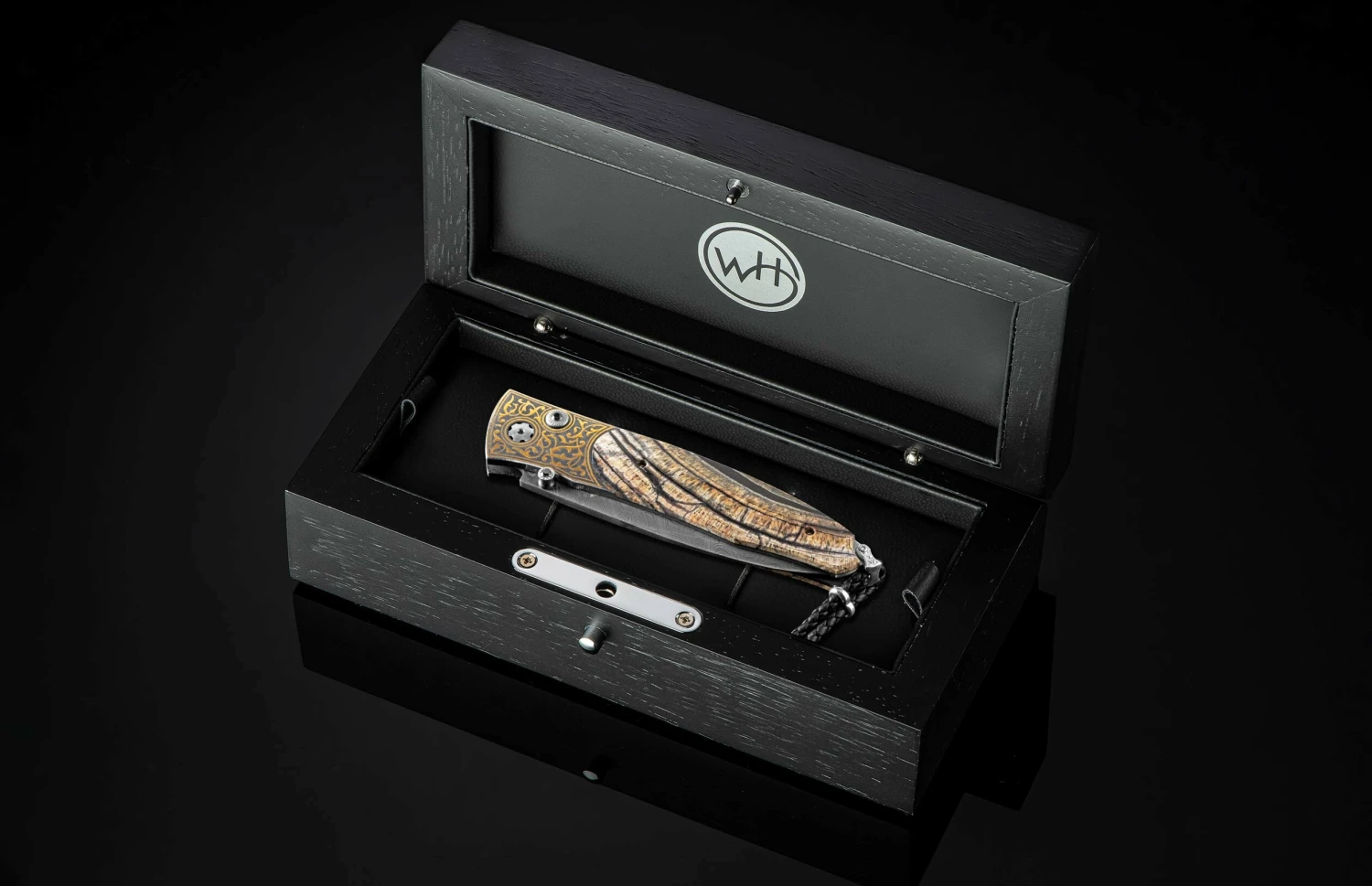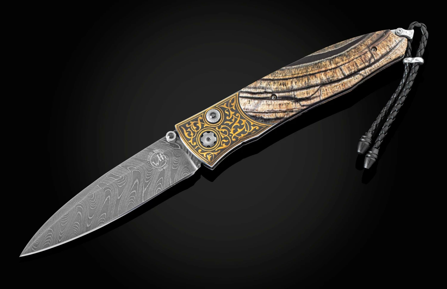 The Gentac ‘Golden Eye’ features a mesmerizing frame in 24K gold Koftgari (the ancient Indian technique of inlaying gold and/or sterling silver in tool-steel), inlaid with the ‘ring’ section of a 10,000 year-old fossil Woolly Mammoth tusk. The blade is hand-forged ‘Boomerang’ damascus by Mike Norris; the one-hand button lock and the thumb stud are set with spinel gemstones. An exceptional design that offers rigorous performance in a sleek, comfortable knife, the Gentac is also the perfect canvas to showcase William Henry’s range of exotic materials and techniques. The ‘Golden Eye’ features some of the exotic materials and forged metals that are the hallmark of William Henry’s collections.