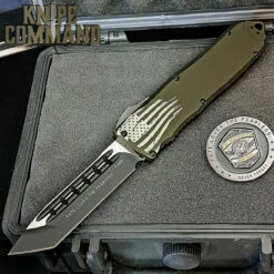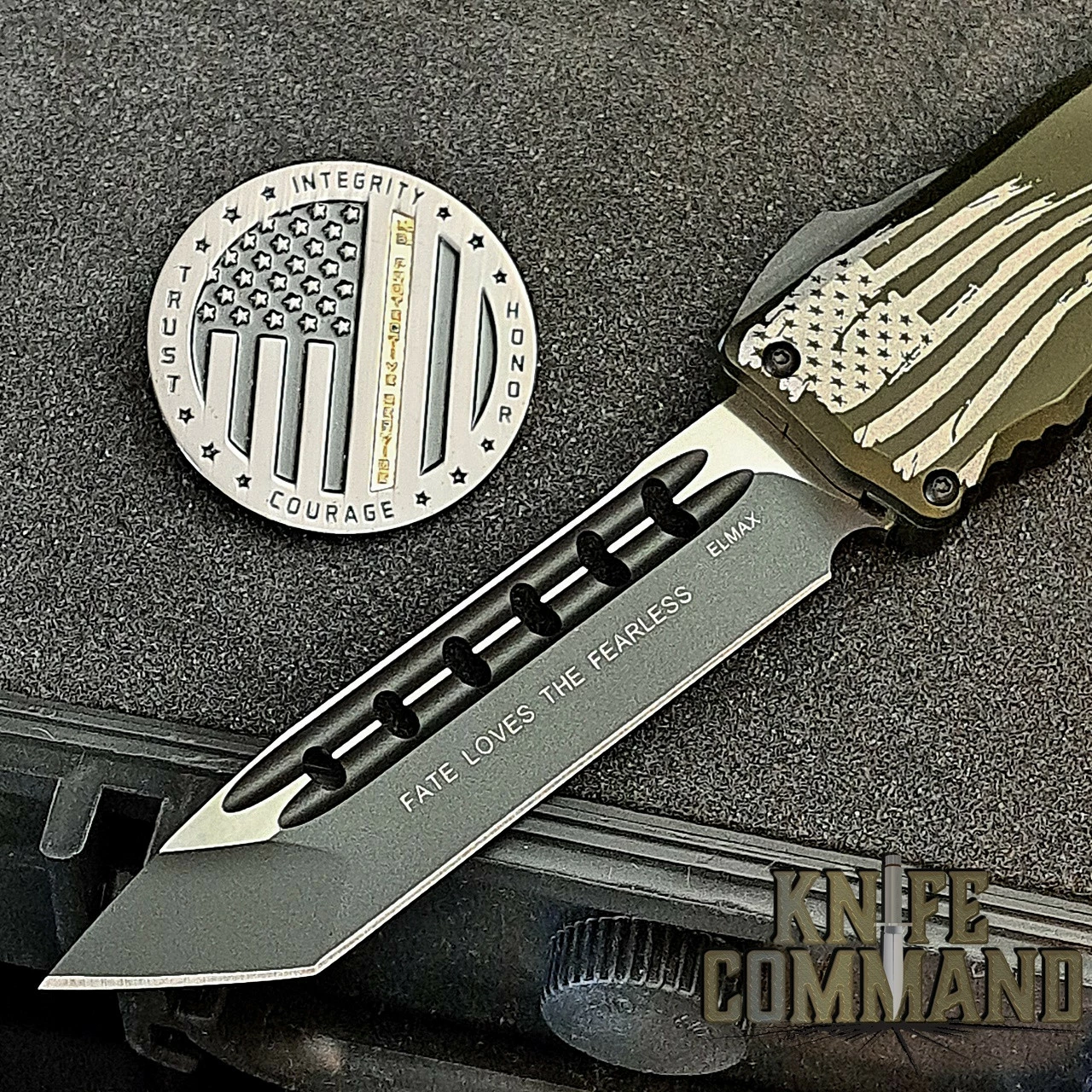 The Recon-Elite Double-Action Automatic has an overall length of 9.75” and a closed length of 5.625″”. The 4.1″ fine edge, Tanto-point blade is made of all Black finished ELMAX stainless steel. The dual, ventilated blood grooves on the blade allow for lightning fast deployment. The OD Green Type lll Hardcoat Anodized Aluminum handle is has top and bottom jimping for a non-slip grip.   The black thumb slide rides on a stainless steel plate with ceramic balls to reduce friction. It features all black hardware with a black, serial numbered, reversible for right, or left hand pocket clip for tip-down carry. It also has a lanyard hole and hardened glass breaker tip.