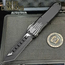 The Recon-Elite Double-Action Automatic has an overall length of 9.75” and a closed length of 5.625″”. The 4.1″ partially serrated, Tanto-point blade is made of all Black finished ELMAX stainless steel. The dual, ventilated blood grooves on the blade allow for lightning fast deployment. The Black Type lll Hardcoat Anodized Aluminum handle is has top and bottom jimping for a non-slip grip. The black thumb slide rides on a stainless steel plate with ceramic balls to reduce friction. It features all black hardware with a black, serial numbered, reversible for right, or left hand pocket clip for tip-down carry. It also has a lanyard hole and hardened glass breaker tip.