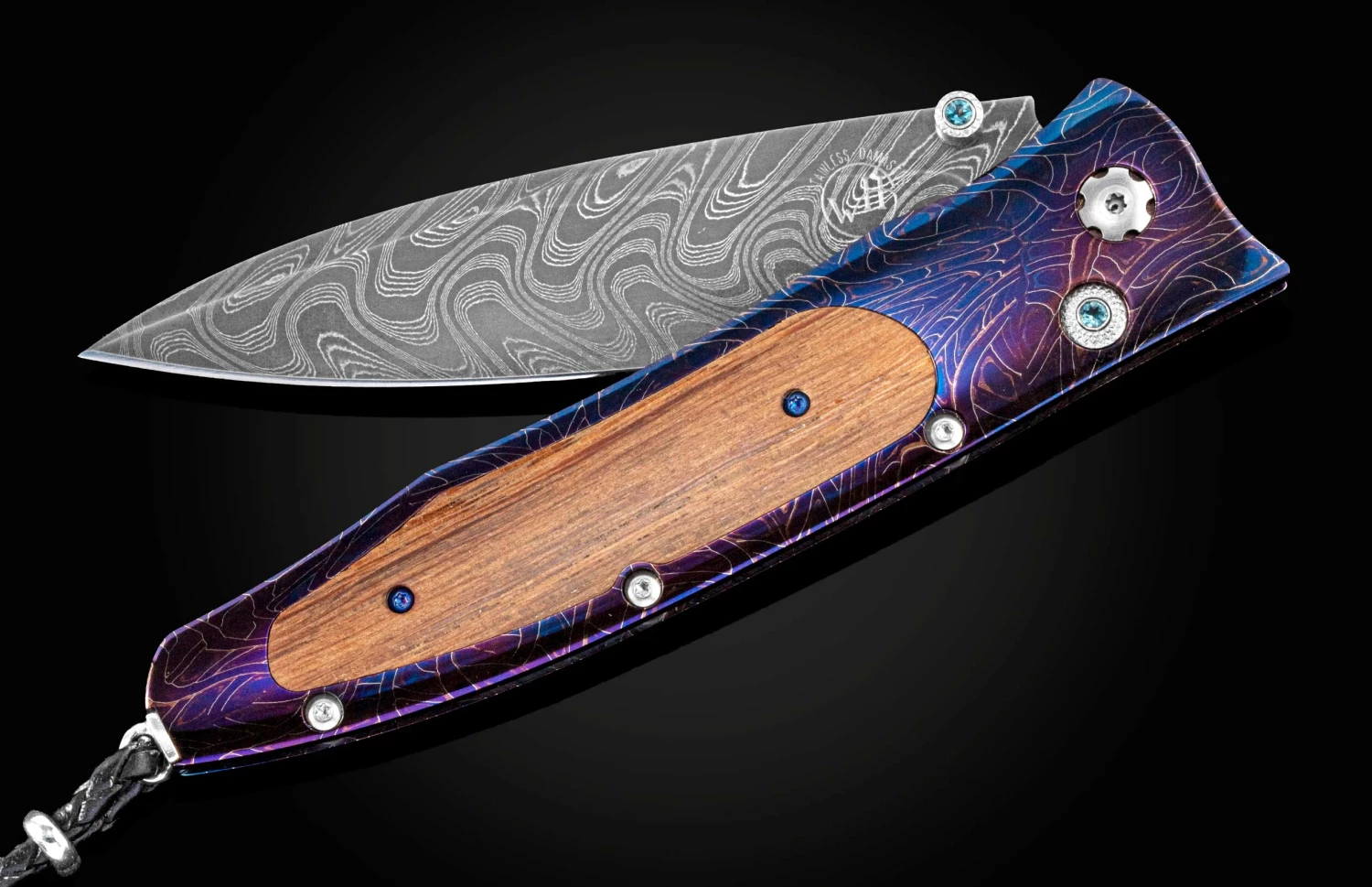The blade is hand-forged ‘Boomerang’ damascus by Chad Nichols; the one-hand button lock and the thumb stud are set with blue topaz gemstones.
