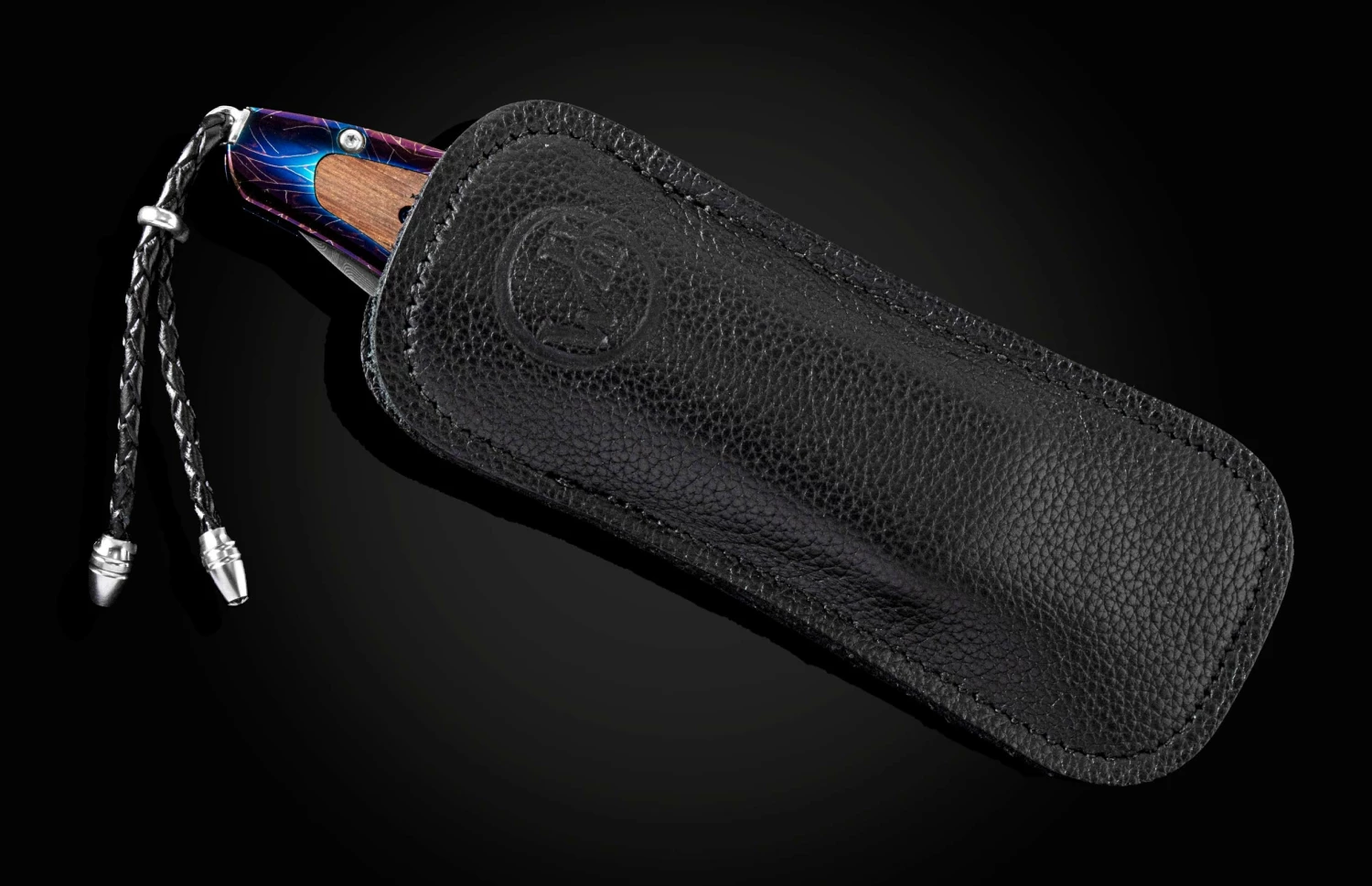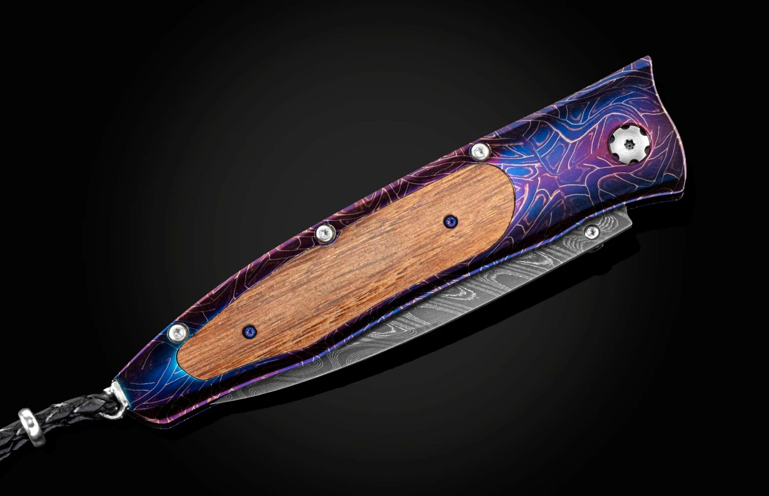 The Gentac ‘Hornblower’ features beautiful bolsters in hand-forged ‘Brain Wave’ damascus by Chad Nichols, inlaid with oak wood reclaimed during the restoration of the H.M.S. Victory.